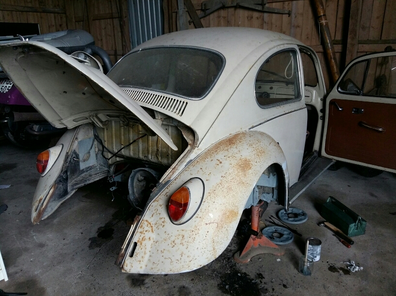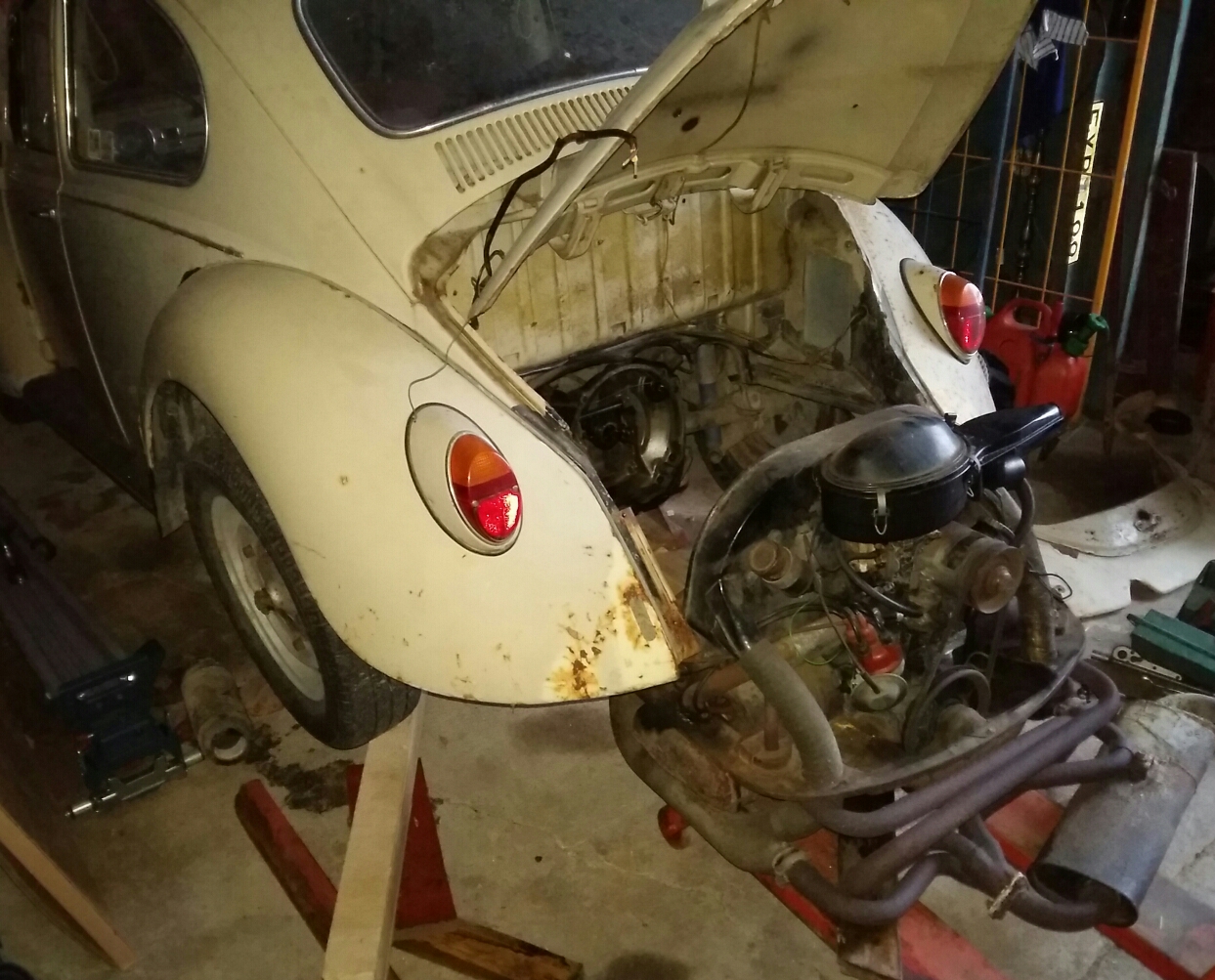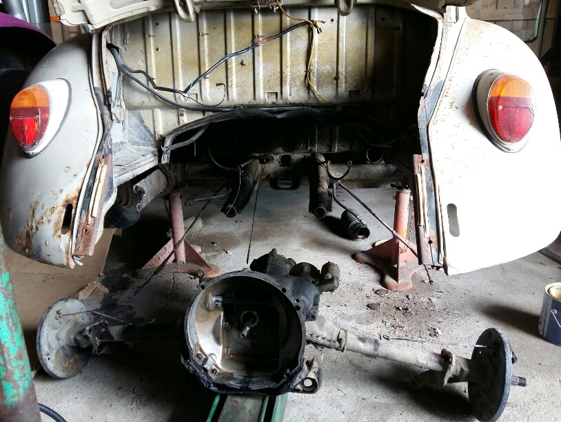 Har bubblan på en loge med betånggolv , så ingen värme till vintern. Tänkte därför få klart bakbromsar och allt runt bakaxel. /växellåda. Kanske få i 1500cc motorn och provköra. Så här ser det ut.