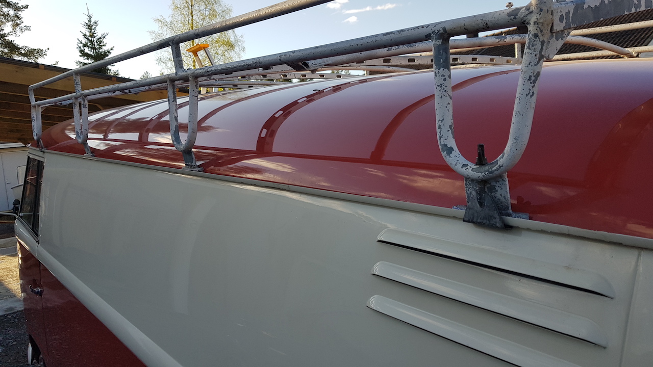 Detta takräcket satt på den blå 73:an och Herr´n jag köpte den av sa att räcket kom från en 50-talsbuss någon gång för 20-30 år sedan.