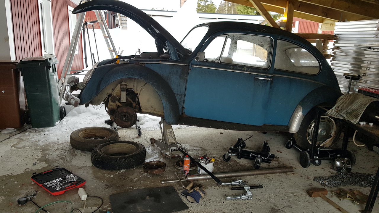 Nu har jag äntligen fått tummen ur avgasröret och påbörjat bromsjobbet på 66:an som ska bli fruns. Jag funderar på att kalla den för "Blåtand"... Vi får C  ICQ/aj