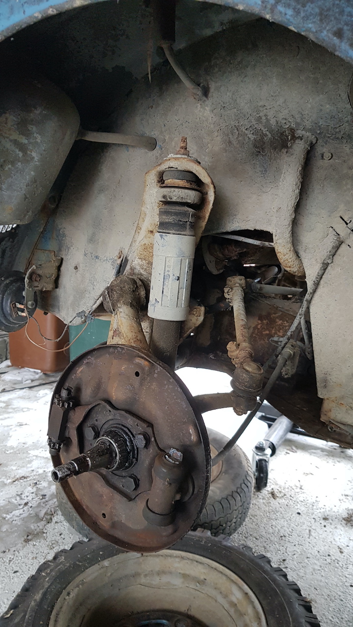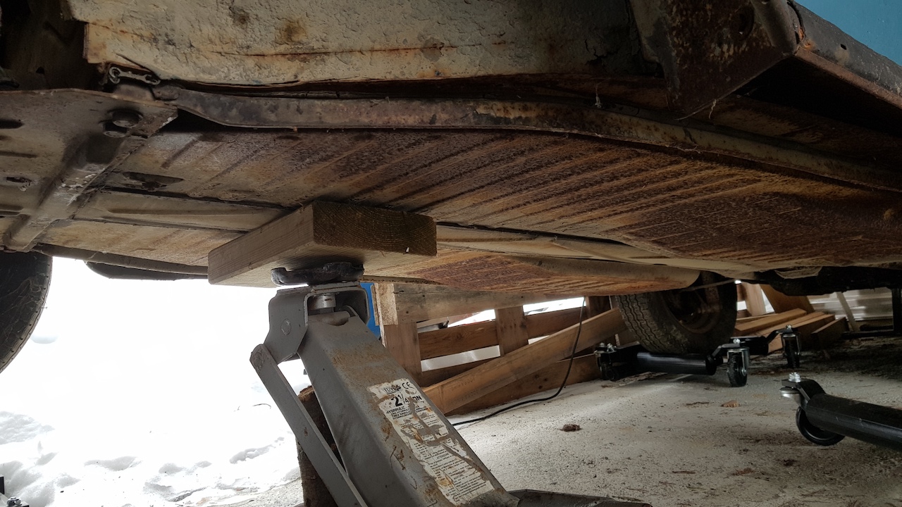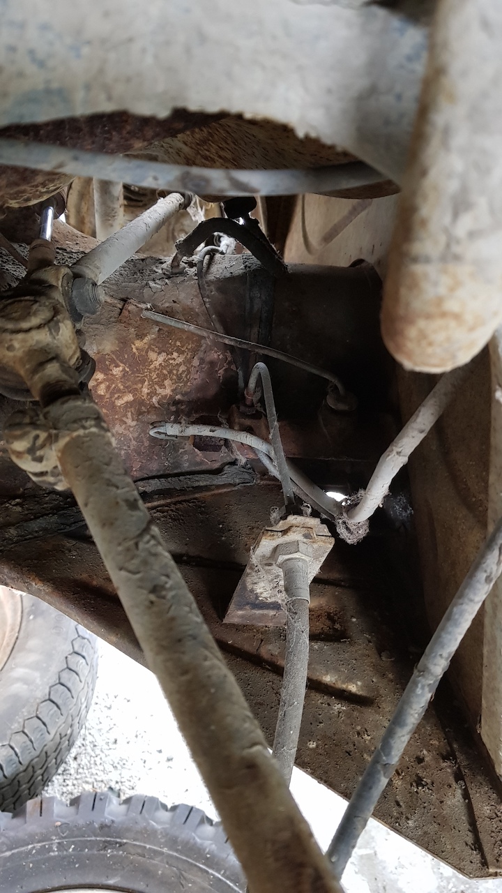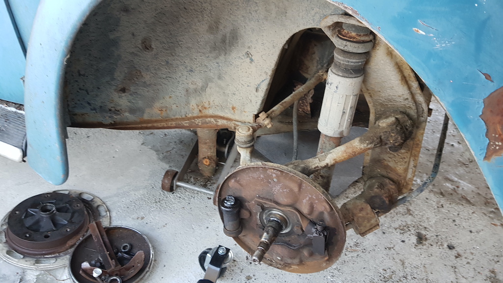 Nya bromsdelar är beställda och jag byter allt jag kommer åt utan att lyfta karossen. Plattan ser förövrigt relativt grei ut med tanke på att den stått still på en myrliknande yta i nästan 30 år.