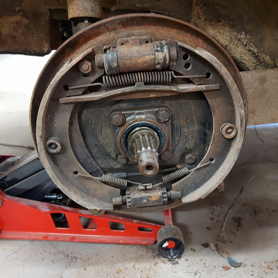 Satte i en B låda tidigre för att kunna ha drivaxlarna så jag kan få ner den på fyra hjul och putta runt den i garaget men då men b bromsar ,provmonterade a bromsarna nu och det verkar lira . Kommer renovera dom senare men nu är dom iaf på plats