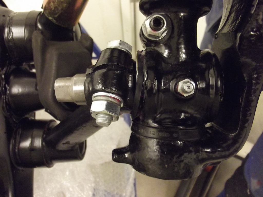 Styrningen har ju en vinkelarm som är monterad på framaxeln. Den består av en axel lagrad i smorda bronsbussningar.