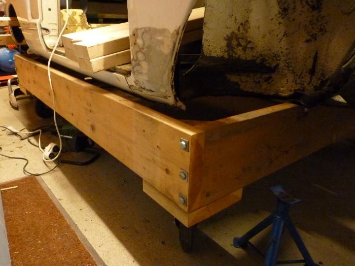 Ok karossen lyftes från vagnen som den ligger på (även kallad pansarkryssaren Potemkin). En konstruktion gjord av 195x45 som jag hade liggandes. Tanken  var att jag skulle kunna dra hela klabbet ut  och in i garaget men vagnen väger nog mer än hela bilen så den står där den står. Man kan ju inte lyckas jämt  ICQ/ad