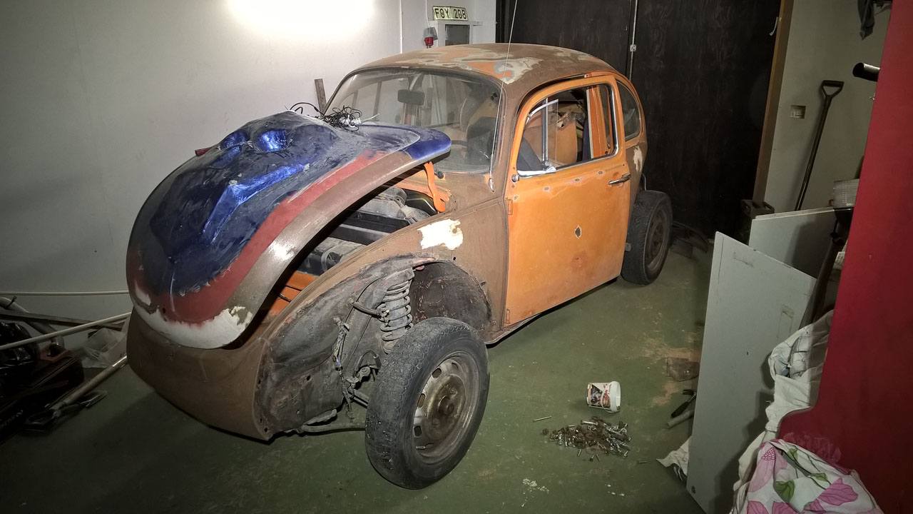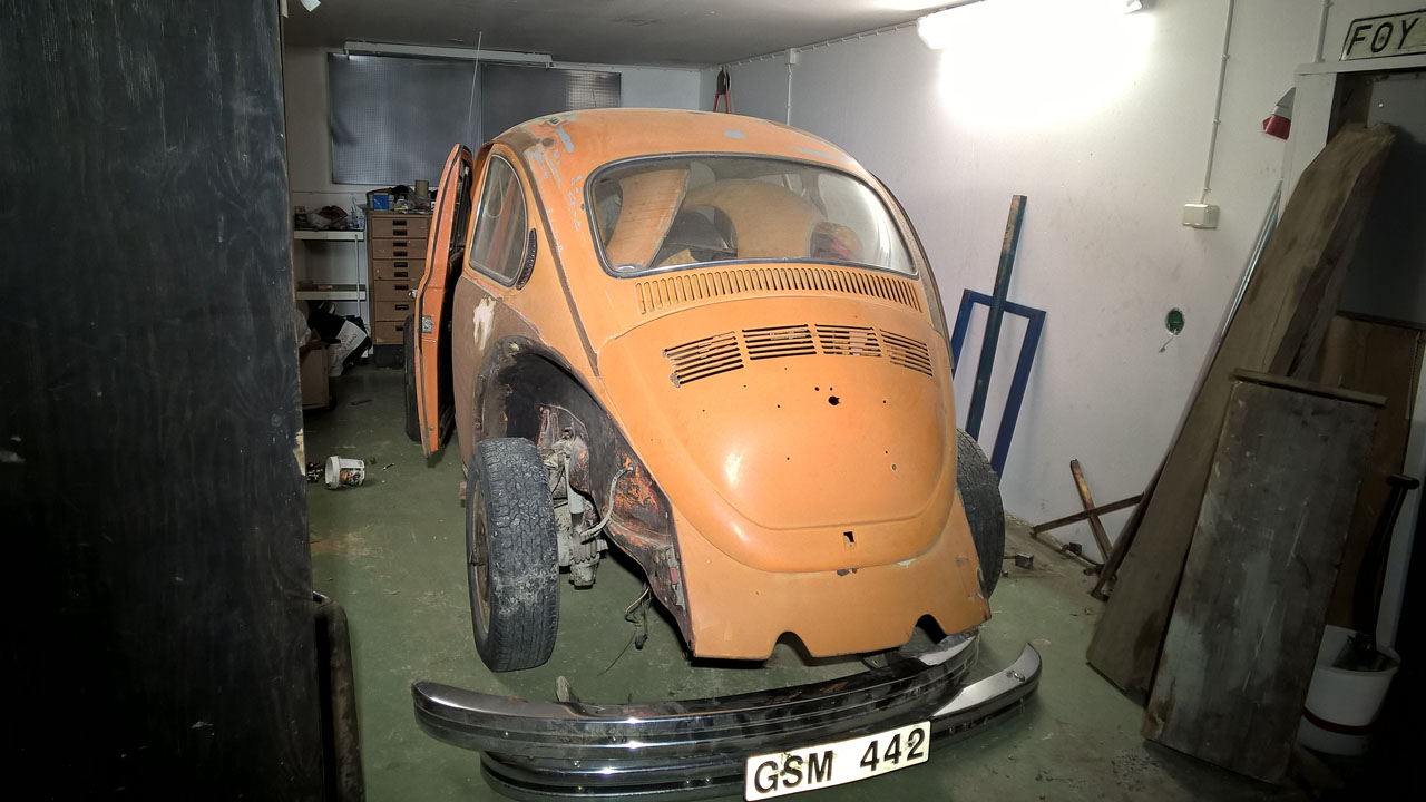 Det är som rubriken säger en 1303s från 73 som tidigare ägare har börjat jobba på. Om man bortser från ytrost där den slipats plåtren och något enstaka ställe så är bilen så gott som rostfri såväl på utsida som insida och undersida. En väldigt fin kaross att jobba vidare på om man inte gillar att svetsa. Döskallen på huven bjuder jag på