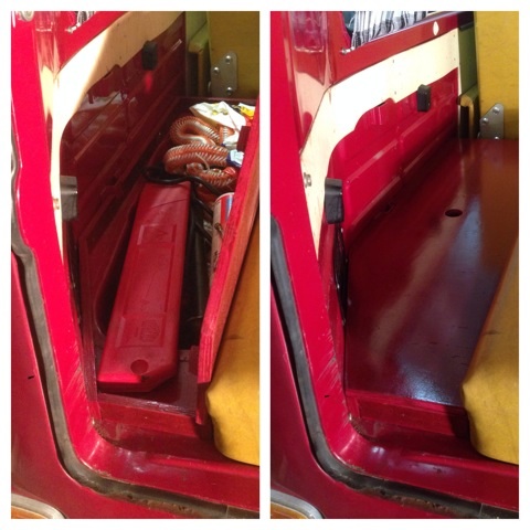 Reservhjulsbaljan har fått en ram av plyfa, ett lock och en lite tunnare madrass ovanpå. Rymmer nu drygt 5 liter verktyg, domkraft (som tyvärr numera inte lyfter tillräckligt högt  ICQ/ac ), startkablar, bogserlina, reservhjul på burk, varningstriangel samt lite annat junk.