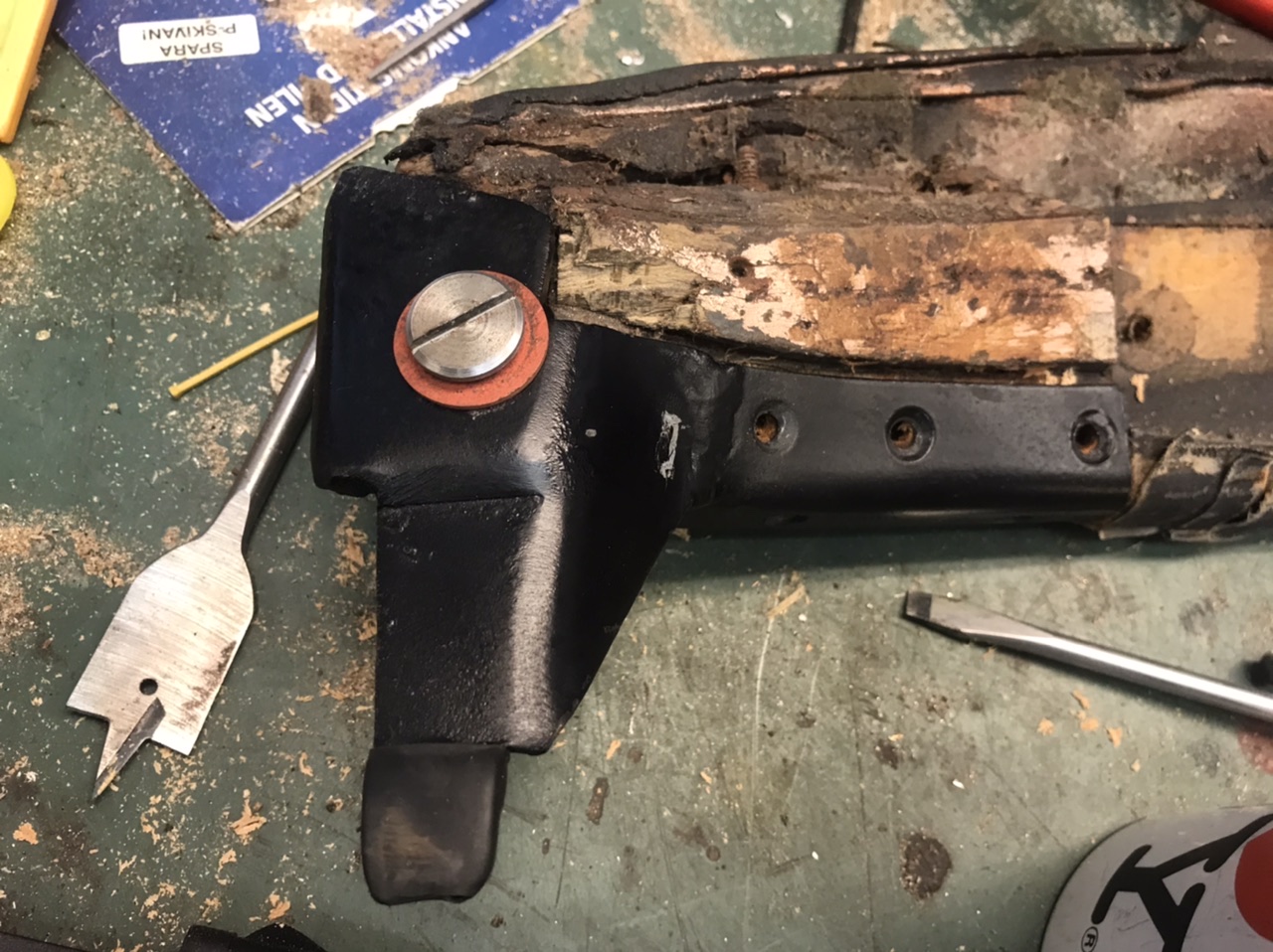 Frontbåge nr1 som var tillverkat ”i något hårt material” ligger i skrotlådan och en ny schweinedyr i trä inköpt. Den passar skit den med men går ju att modda.