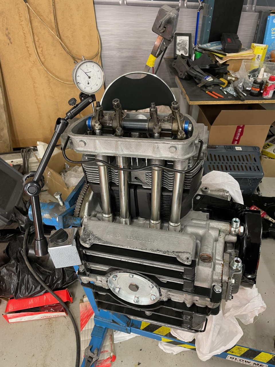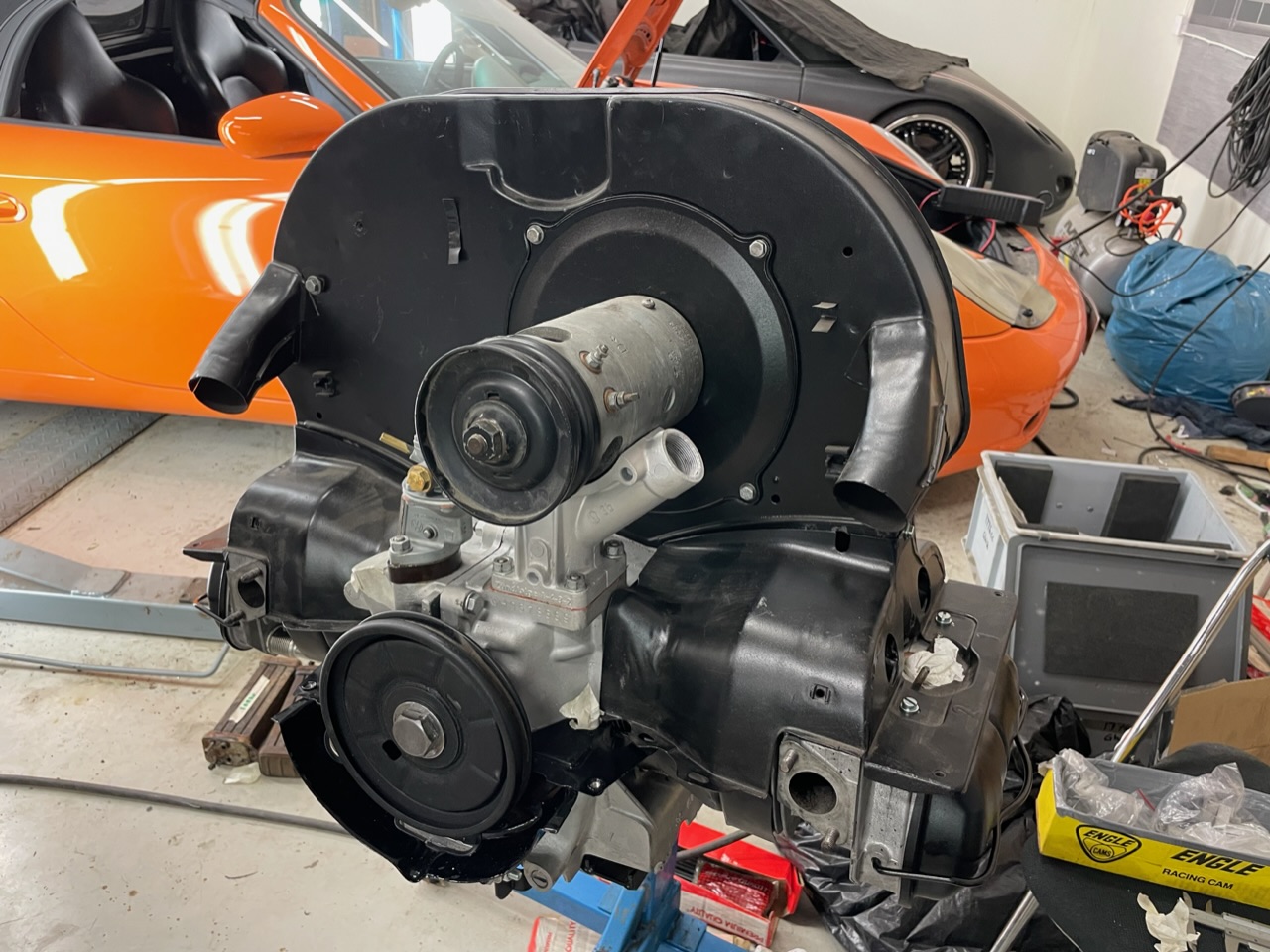Allt mekaniskt på motorn monterad och nu börjar det roliga att passa in all kringutrustning. Kommer dock köra in den med 009 fördelare, singelförgasare och kylplåtar från reservdelslagret.