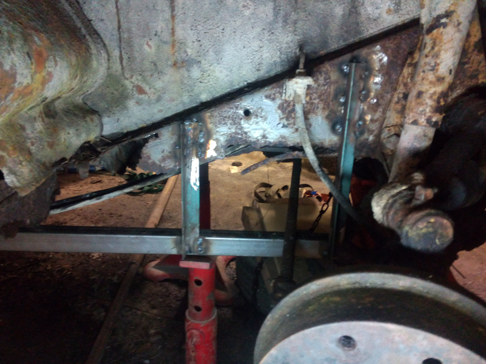Lösning blev att väldigt provisoriskt svetsa på en ram av fyrkantsrör under båda ramskenorna som vi sedan kunde lyfta i för att få bort vagnen.