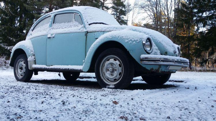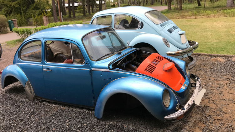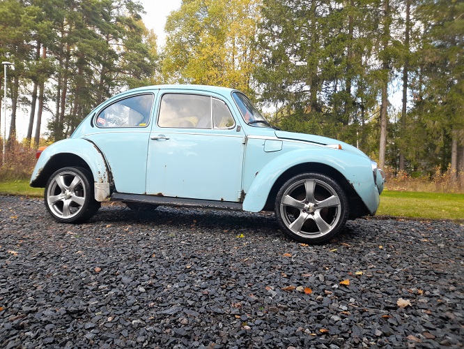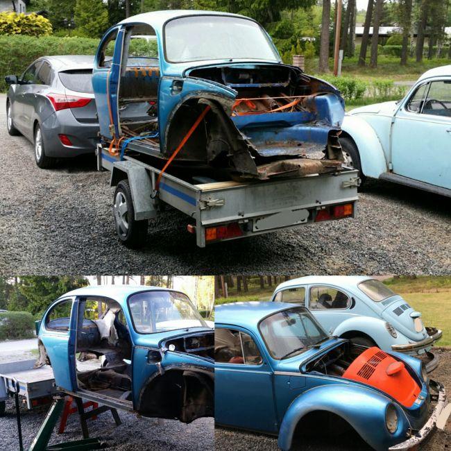 Fick en 75a 1303s med sopslut golv och kaross som saknade motor, låda, inredning, framvagn och bakvagn. Den var hyffsat bynglig att ta hem men var snäppet värre att lasta själv på en 750kärra... men det blev en del delar som jag hoppas kunna använda iframtiden.