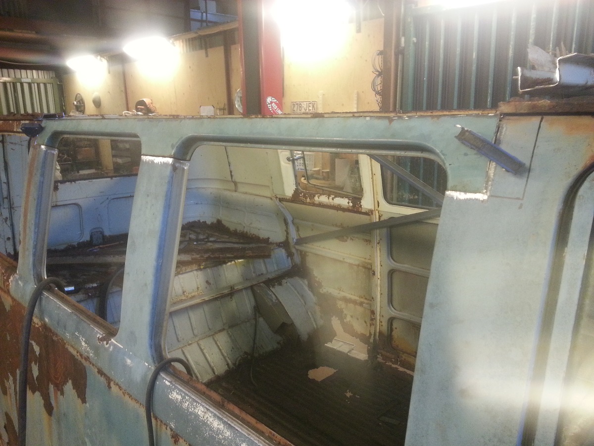 Fortsätter med taket. Ett väldigt mätande och lyftande av taket av och på, det var verkligen guld värt med travers. En utmaning var att taket kommer från en -67 med skjutdörr på höger sida.. Min har ju lastrumsdörrar på vänstra sidan. Bakluckan och utseendet på taket där bjöd ju också på lite att göra. Ber om ursäkt igen för de dåliga bilderna, jag ska uppdatera med ny telefon!