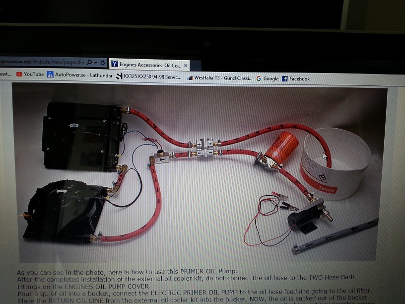 Med motorn kom en pump. Rekommenderas att skölja runt olja via en hink ett par varv, utifall det skulle finnas skräp i kylarna. Tänker nog hetta upp oljan till 85 grader så thermostaten öppnar till fullt flöde. När det är sköljt ska en slang anslutas till motorn och sedan köra tills pumpen stannar. Dit med sista slangen och sedan fylla upp till rätt nivå i motorn. Den skitiga hinken kommer bytas mot rostfri kastrull när det blir skarpt läge.