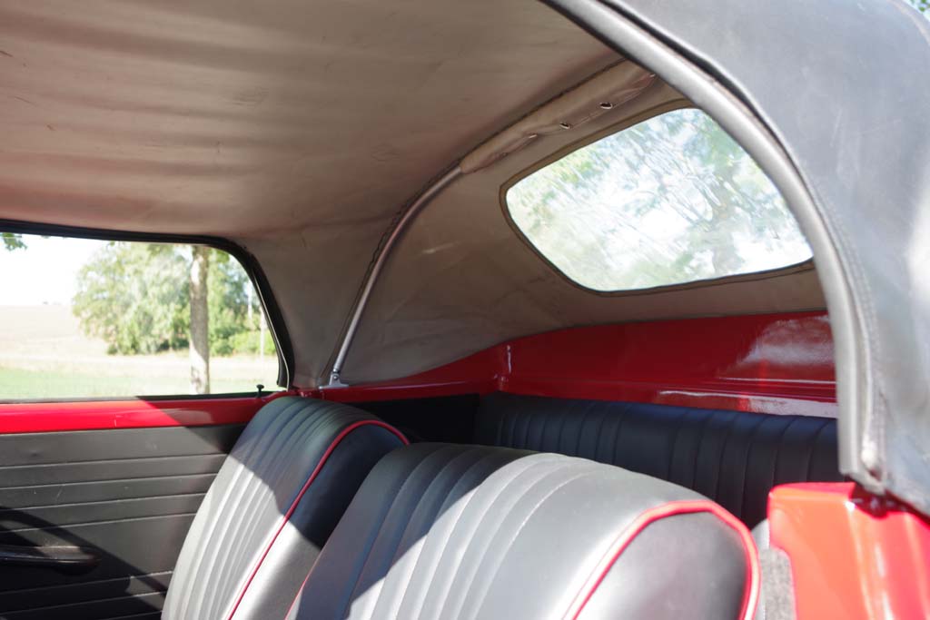 Fin inredning med stolar och baksäte omklädda i svart galon med röda lister.