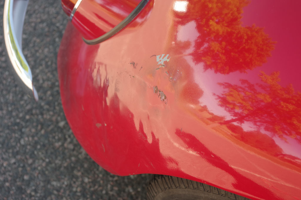 Höger bakskärm är bucklig och vänster framskärm är delvis omlackerad. I övrigt bra i plåten och det finns ingen rost. Lacken är bättrad på sina ställen och det finns nyanskillnader.