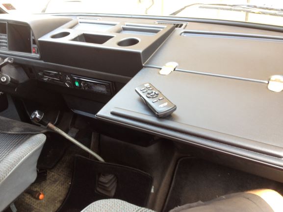 Den är tillverkat i ngn typ av ABS plast och lite vinglig, den var förstärkt med trä undertill...men jag kompletterade med att limma dit en plåtskiva för att styva upp den mer, allt beroende på hur pedantisk man är...sedan bara att borra fast med plåtskruv rakt i instrumentbrädan...