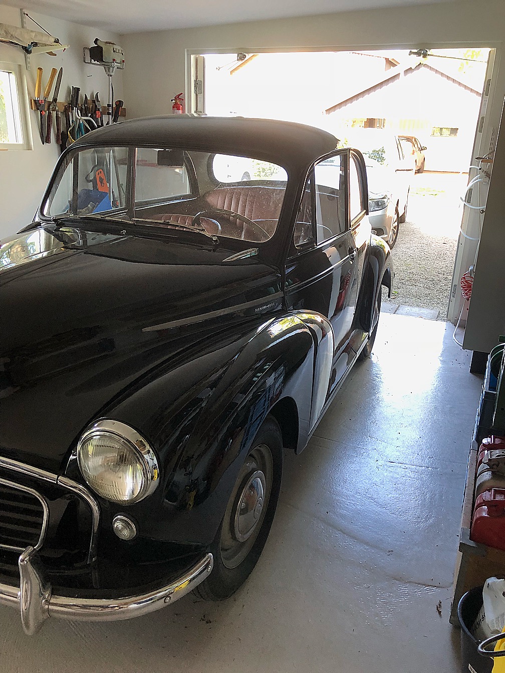 Det är en jättefin org svart Morris minor 1000, två dörrars. Besiktigad och går kanonbra.