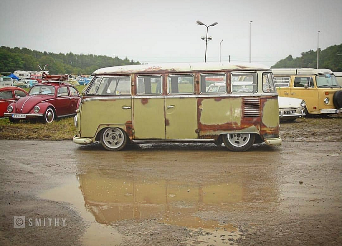 11-fönsters som någon gång i tiden blivit ombyggd till 15-fönsters och lagad med varierande resultat. Så många fel så det blir rätt…tex fel skärmkanter bak, en fel skärmkant fram osv, rost finns det uppenbarligen gott om, ytrost, gravrost men inget som är någon panik med, åk som den är eller fortsätt att förbättra den, men ingen bil för den kräsne eller för en finare renovering.