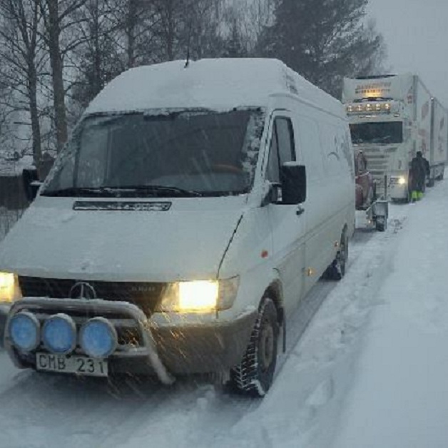Ja ja, Tur man har många mil i ryggen sånna här gånger. Allt från timmerbilar och flisekipage till rallybilar och likbilar. Det mesta har jag rattat i ömse väderlek och vet att bara man tar det lugnt så brukar det gå bra. Även om det får ta lite tid. Och tid tog det. Framåt Gävle kom jag i alla fall ikapp en å annan bil. Som kom ikapp en till, och en till... En liten bilkö så småningom som ormade sig frammåt i 30-40 kmh som högst. FAAAAAN!!!!! Jag höll på bli idiot! Van ett högre tempo ville jag om till varje pris. Men snöröken stod tät och med 3 ton buss å släp smiter man inte bara om en hel bilkö sådär utan vidare. Speciellt inte med en motor bara obetydligt större än en hyffsat frisk Briggs & Stratton under huven.