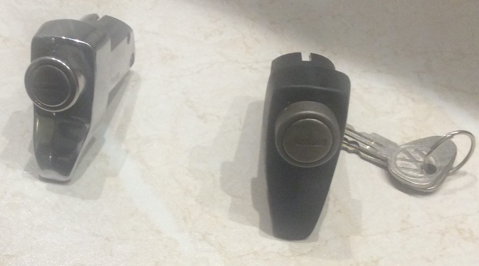 Nya original lås till motorlucka. Det svarta med två nycklar, det kromade utan nyckel , men med nyckel-nummer. Pris 300:-/st. Finns i Helsingborg.