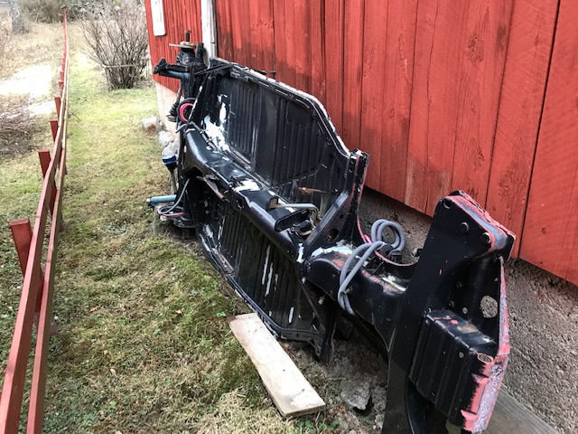 Jag har en bottenplatta utan ID som var tänkt som stordonator men nu blivit över. Svetsad på några få ställen, annars bra skick tycker jag. Inga stolsskenor kvar. Hämtade den i detta skick med grund- och täckfärg ovanpå en väl rengjord yta men den svarta färgen har flagnat lite, ingen underredsmassa kvar. Svingarmar, drivaxlar med osäkert skick på knutar, bromssköldar bak och pedalställ kvar.