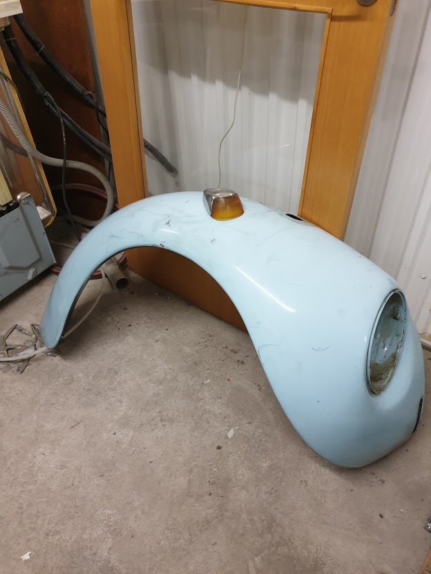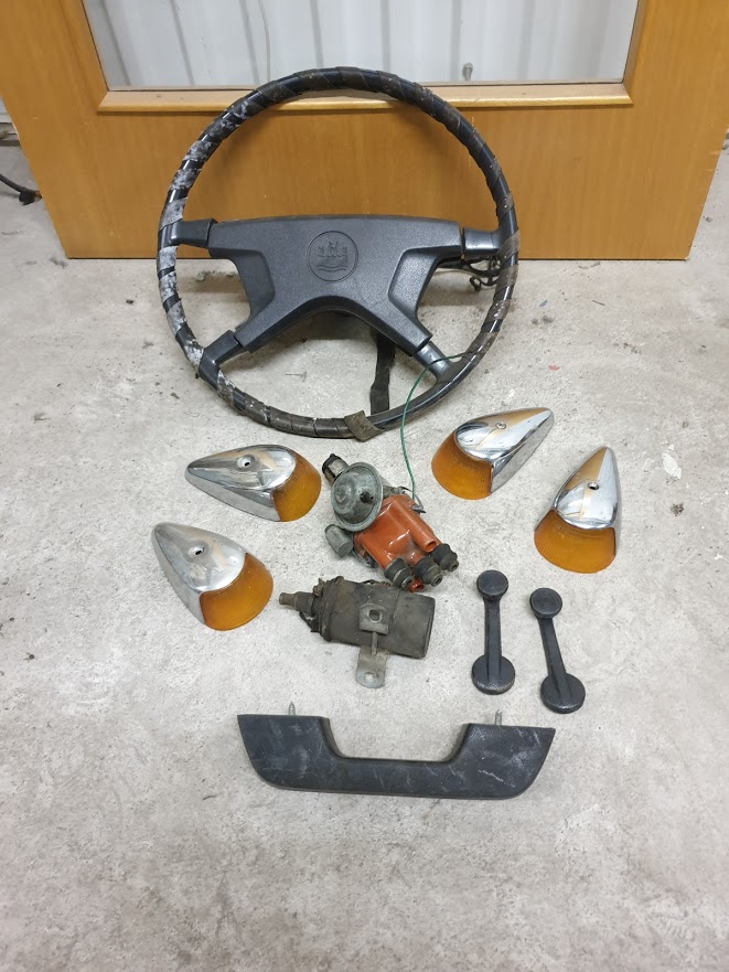 Höger framskärm, vindruta, ratt, tändfördelare, tändspole, fyra orange blinkersglas, två fönstervevar, kurvhandtag