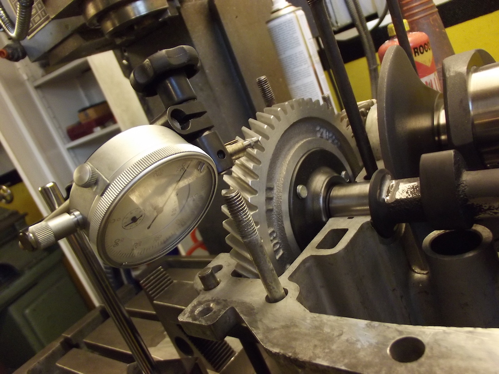 Sen kommer vi till en intressant sak i motorbygge, kamdrevet. När man köper kamdrev till vanliga typ 1 kammar finns det bara en storlek. Men hur ska man då justera kuggspelet (backlash på engelska)? Det går ju inte att flytta på vevaxel eller kamaxel. Spelet ska vara ganska litet typ 0,00 - 0,05 mm. Har hört att en del snurrar vev/kam med ventilpasta på dreven för att få större spel. Men att få mindre spel är ju inte så lätt.