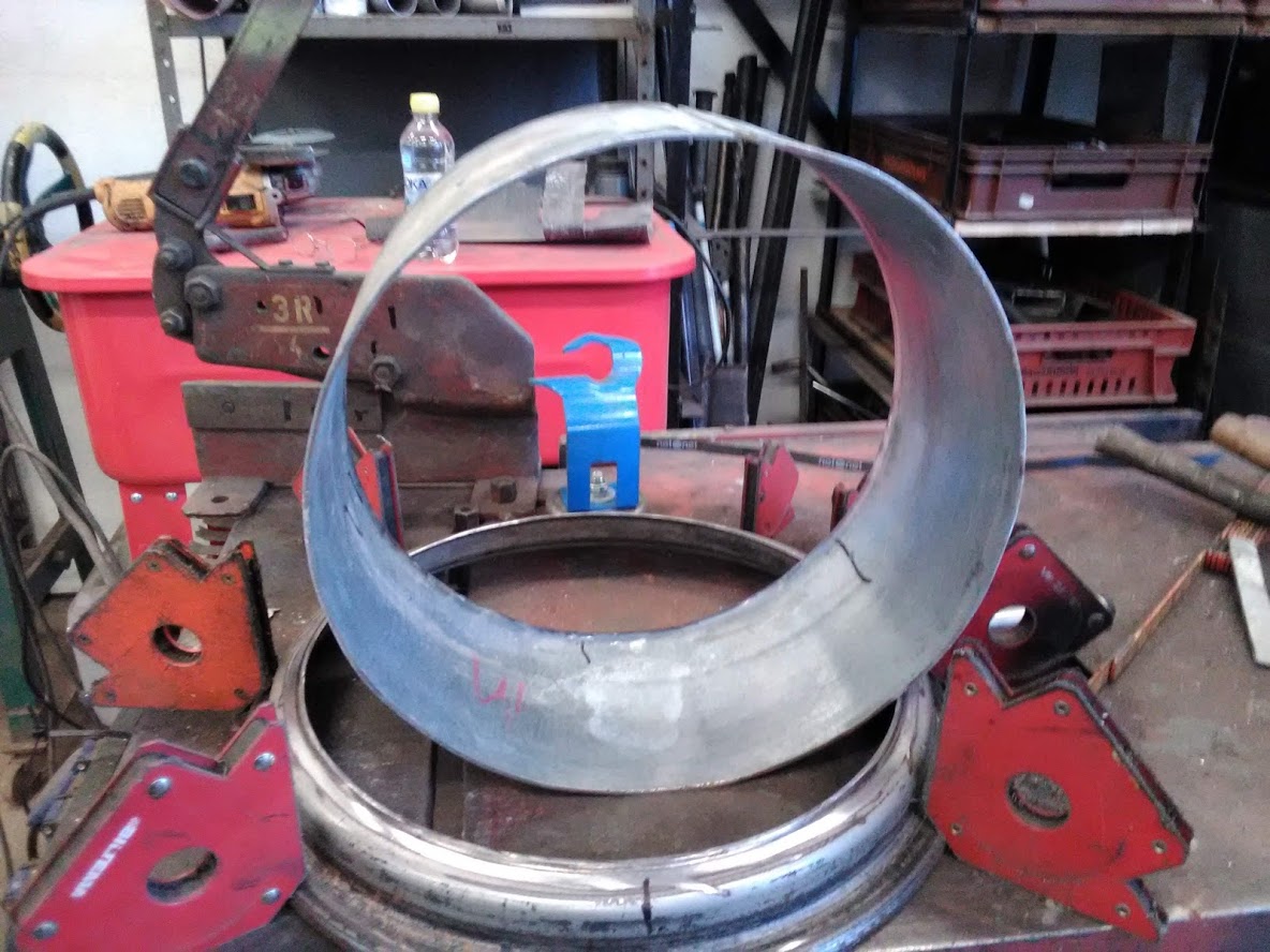 i går så började jobbet med breddning av bak fälgar o det visade sig att tog man en amazon fälg o vände den åt fel håll så blev det bra bredd inåt, sen har jag kollat med 2 smides firmor om matrial o valsning av plåten men inget hände så jag kapade till remsor av en plåt grov böjde den över tunnplåts bocken o fin justerade över en gas flaska själv är bäste dräng , sen var det de där med att få på ett slicks o det gick inte jag måste svetsa in en inre plåt som fälg bana för att få däcket tätt nog att blåsa upp så det fixar ja i dag + att det är dags att bygga en tank i gasser stil