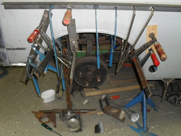 Jag använde inget mothåll utan borrade hål i den nya panelen först med 5 cm mellanrum där falsen skulle ligga och passade in den nya panelen med 2 självborrande plåtskruvar mot bakhörnet och lodrätt/vågrätt på karossen i falsen. Borrade därefter hål i samma storlek som popnitarna i falsen genom den nya panelen (3,20mm i mitt fall) och utförde därefter limjobbet enligt rekommendationer härifrån - plåtrent på det som ska limmas på panel och fals/kaross och se till att det är väldigt rent med exempelvis silicon remover eller bräkleen. Applicera limmet på både panel/ fals och kant och sedan skruva/nita. Använde svetstänger av varierande storlek för att fästa panelen mot hjulhuskanten. Lät det härda ett dygn och borrade efteråt ut nitarna/ tog bort skruvarna och limmade igen hålen.