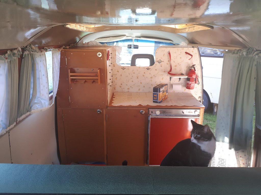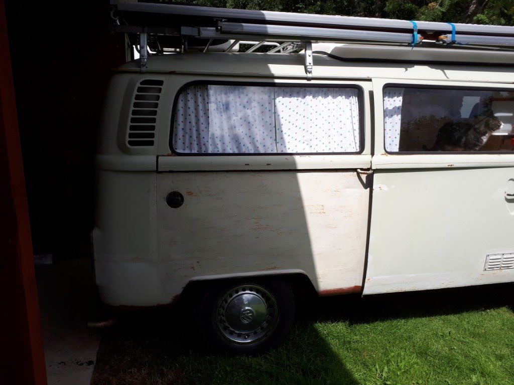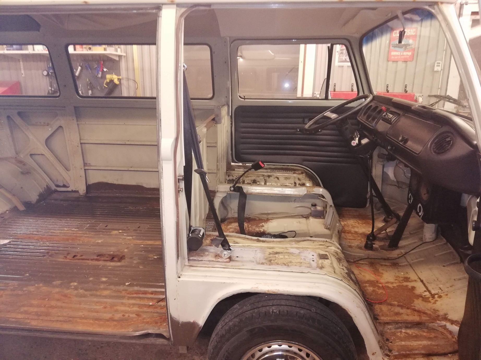Lite bilder från när jag hämtade bussen! Den groteska campinginredningen gjord av masonit och OSB plywood är bortkastad för utbyte mot en kommande westfaliainspererad inredning. Av någon anledning hade även gamla ägaren satt dit en early bay skärmkant och dessutom helsvetsat sömmen på passagersidan.. Detta är självklart åtgärdat nu.