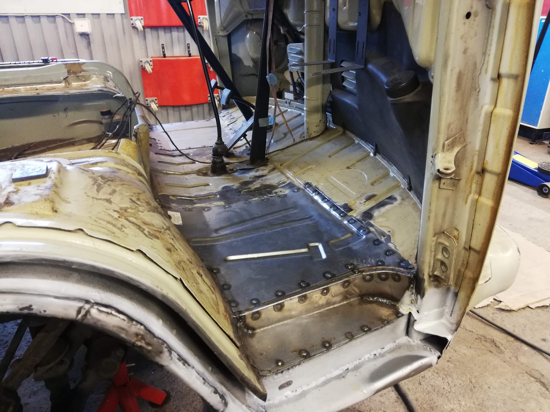Bussen ställdes in i garaget och städas ur för att påbörja rostlagning. Lite före och efter bilder på framskärmar/främre golv. Jag valde tyvärr klockerholms billiga ekonomiplåt fram och kan som många andra intyga att plåten GÅR att få dit men har inte världens bästa passform. Man får det man betalar för helt enkelt. Golvdelarna kommer att helsvetsas alternativt limmas framöver då jag ska karosserilimma bakskärmarna. Jag funderade på att återställa mellanväggen för att ha en kaptensstol och dubbelsäte men lutar som jag tidigare nämnt mot att fullfölja walkthroughkonvertering och köra på 2 kaptensstolar. Vad tycker ni?
