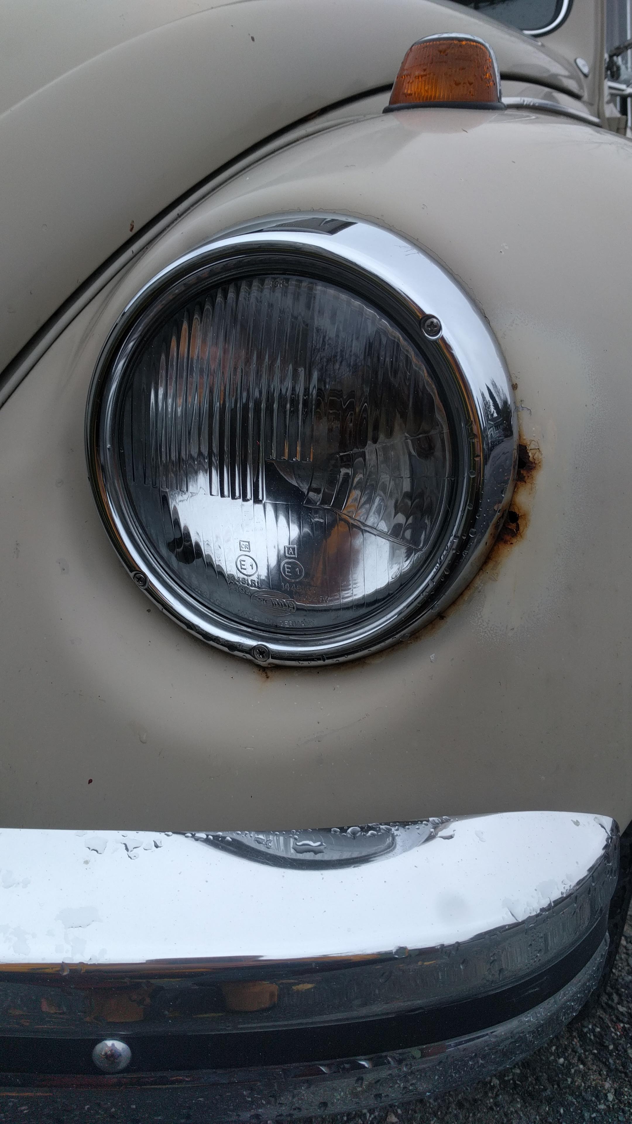 Lite rost kring framlyktor och en gammal lagad fläck ovanför bakruta.