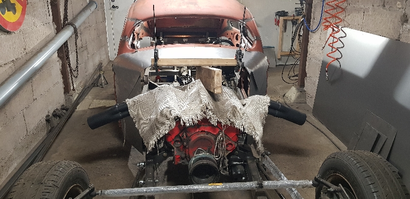 Fortsätter med ramen runt torpeden och rattaxelinfästning. Gör ett U- fäste som ska fixera axel i sitt läge. Detta svetsas fast direkt på rattaxel röret. En anslutnings platta bultade fast på fästet och där sitter grunden för dom förstärkande balkar som ansluts mot plattan i en triangulering. Även en yttre ram kommer till framför den andra, som dels fästs i innerskärmen, men också i tvär och diagonalstag.  ICQ/ar
