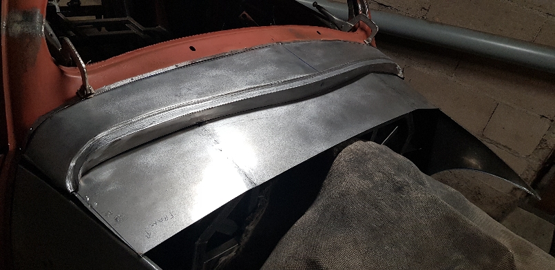Nu är de framdelen runt torpeden som ska få sig lite plåt, så jag börjar med plåten mellan huv och kaross på ovansidan. Skärde till och rulla en plåt passlig i grovt först. Sickade/falsade konturen på huven med en försänkning, och lika så mot kaross sidan.