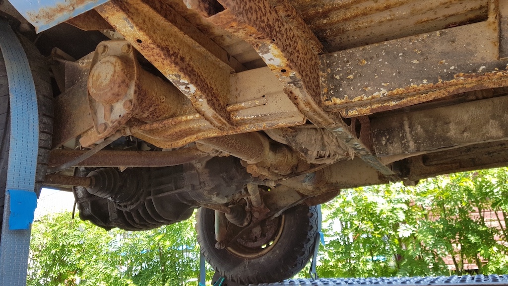 Rost finns men inte jättemycket med tanke på hur den stått. Lastrumsgolvet är värst samt en mindre bit av förarhyttsgolvet. Bussen är torr och fin utan möggelfettalukt som gamla bilar ofta gör nu eftersom den stått inomhus i vinter. Hjulen som sitter på nu är gamla crome-spook fälgar med taskiga gamla vinterdäck. Orginalfälgar med spruckna sommardäck följer med.
