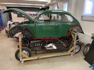Med lite extra muskelkraft, kaross skild från bottenplatta. Byggde en cart/dolly med 70x70 stolpar, tillräckligt stabilt. Gjorde på detta sätt för att komma åt ställen som behöver rostlagas.