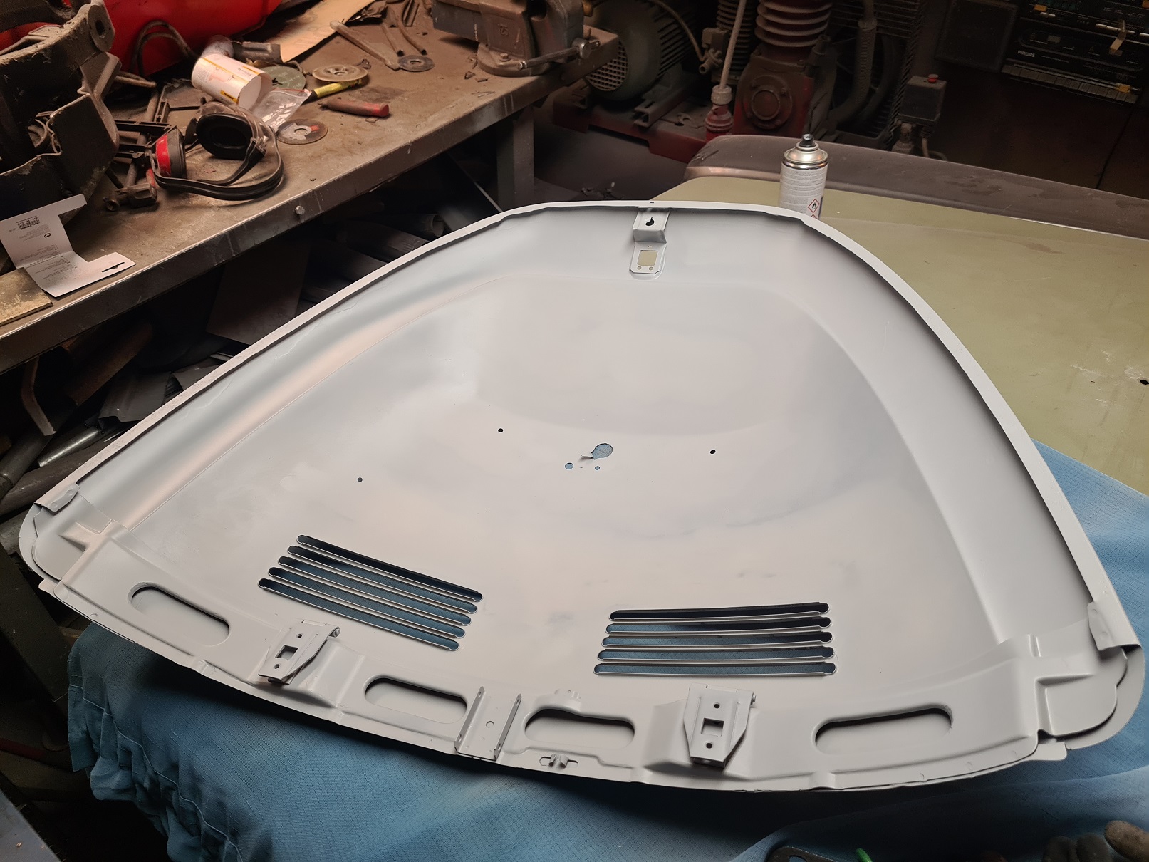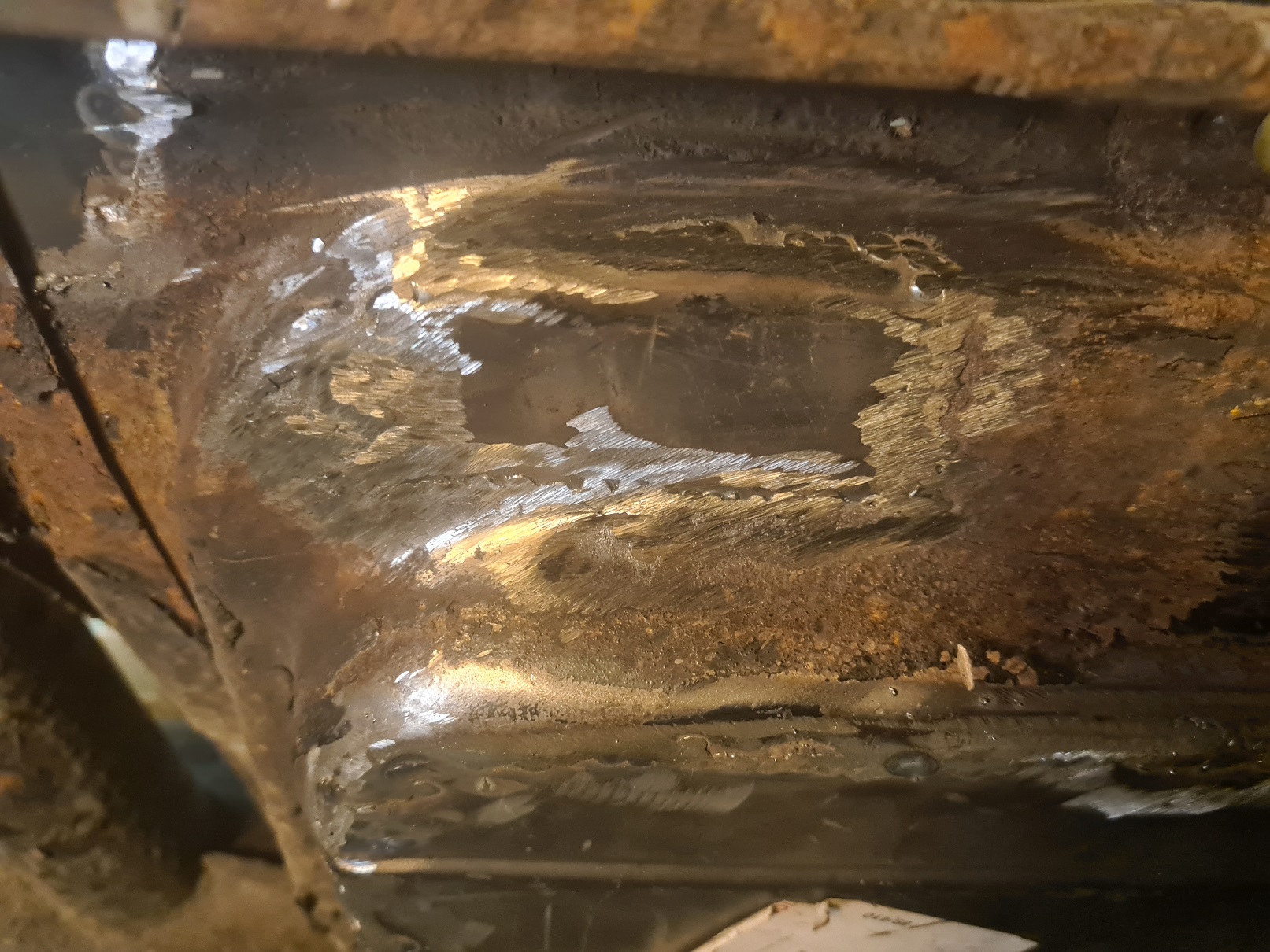 Det blir några bilder på lagningarna i bottenplattan, kanske inte så spännande men ack så nödvändigt. Tanken är att när jag lagat klart den blir det blästring och lack. Åsa fick sin platta pulverlackad, det är jag väldigt nöjd med.