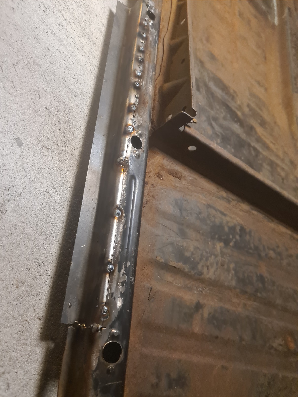 Ramonas bottenplatta var ihopsvetsad med karossen med en sådan L-plåt som man lade under den sönderrostade tröskeln och sen brände man fast den även i bottenplattan. Först blev jag lite grinig och tyckt det var ju en himla fusklagning. Men sen kom jag på andra tankar, kanske tack vare denna "fusklagning" som Ramona finns kvar. Så vi kanske ska vara riktigt tacksamma att någon uppfann denna lösning när dessa bilar mest var slit och släng.