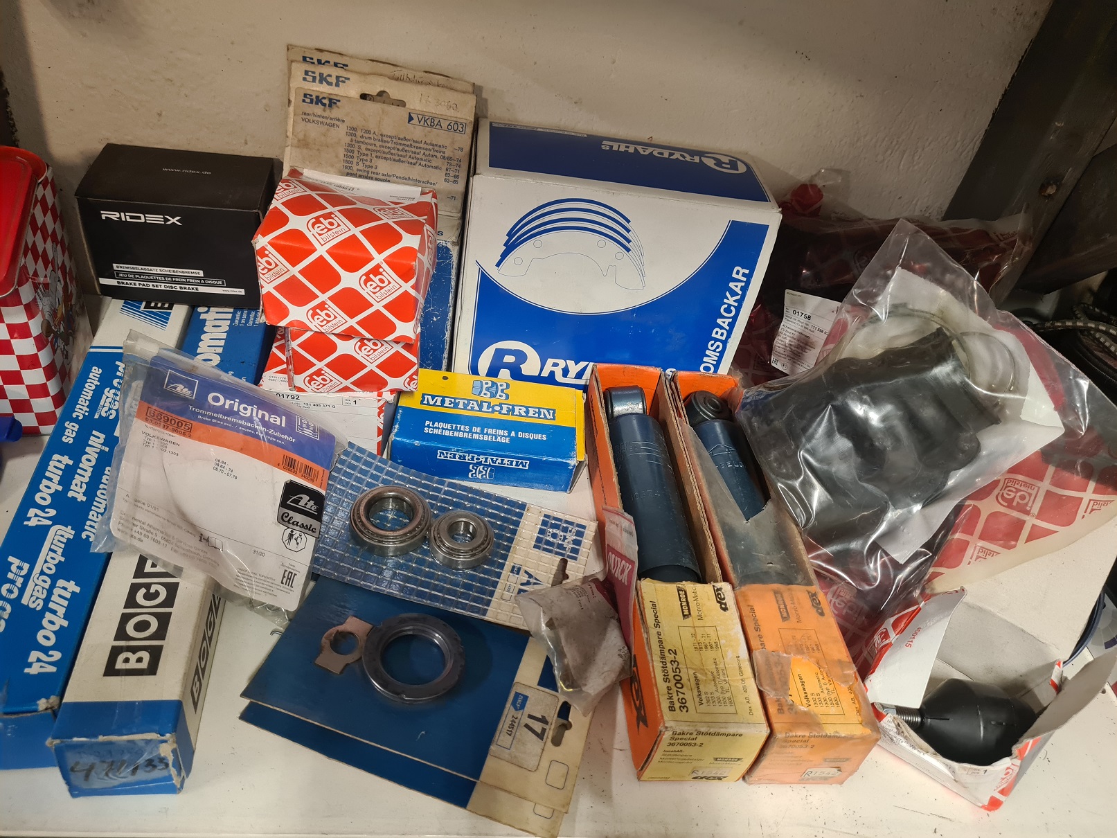 Det ska bli kul att montera någongång i framtiden:) Hittade en försiktig annons om att det fanns några stötdämpare. Skriv vad du har så kollar jag, jodå det fanns fram och bak. Du har ingen styrdämpare, eller något annat? Jag kollar sa han. Det fanns förutom stötdämpare, hjullager fram och bak bromsbackar bak och belägg fram. Lite monteringssatser osv osv. Sen har jag handlat på mig lite när jag ändå beställt från Tyskland.