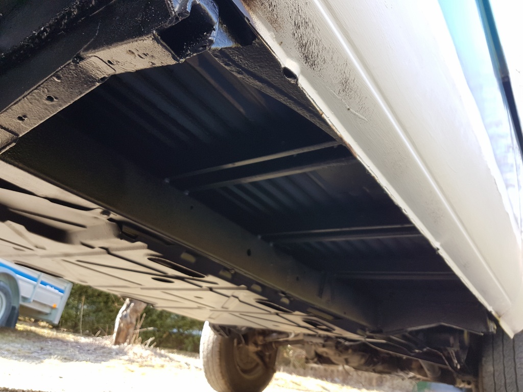 Bytt alla domkraftfästen, bitar av tvärbalkar, inner och yttertrösklar, bältesinfästningar, bitar av lastgolv, med mera. Färdigrostlagad från hyttgolvet och bakåt. Hyttgolvet har några småhål i sig och skulle kunna bytas av estetiska själ (ny plåt medföljer). Ett litet hål mitt på passagerardörren, ca 2 x 3 cm, två små hål längst ned på varje framskärm och förardörren är lite rostig i nederkant, detta är dock bara estetiskt och inget som egentligen behöver åtgärdas, och så lite ytrost här och där.