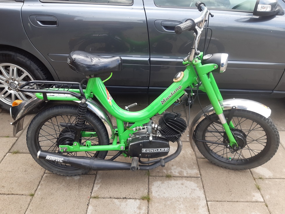 Mustang Mamba 2:a med nästan allt som en Mamba ska ha - som det extra stabila undre motorfästet (så inte ramen spricker o soppan rinner ut.).  Har även den grövre upside down framgafflen. Den Svarta 3-växlade Zündapp - kantmotor med fotväxel.  Pluggalös original 50 kubikare med solfjädertopp,  Effektblås/krök och Bing 17mm ubåtsförgasare - som givetvis har ställbart munstycke. Troligtvis 1977 års mod.