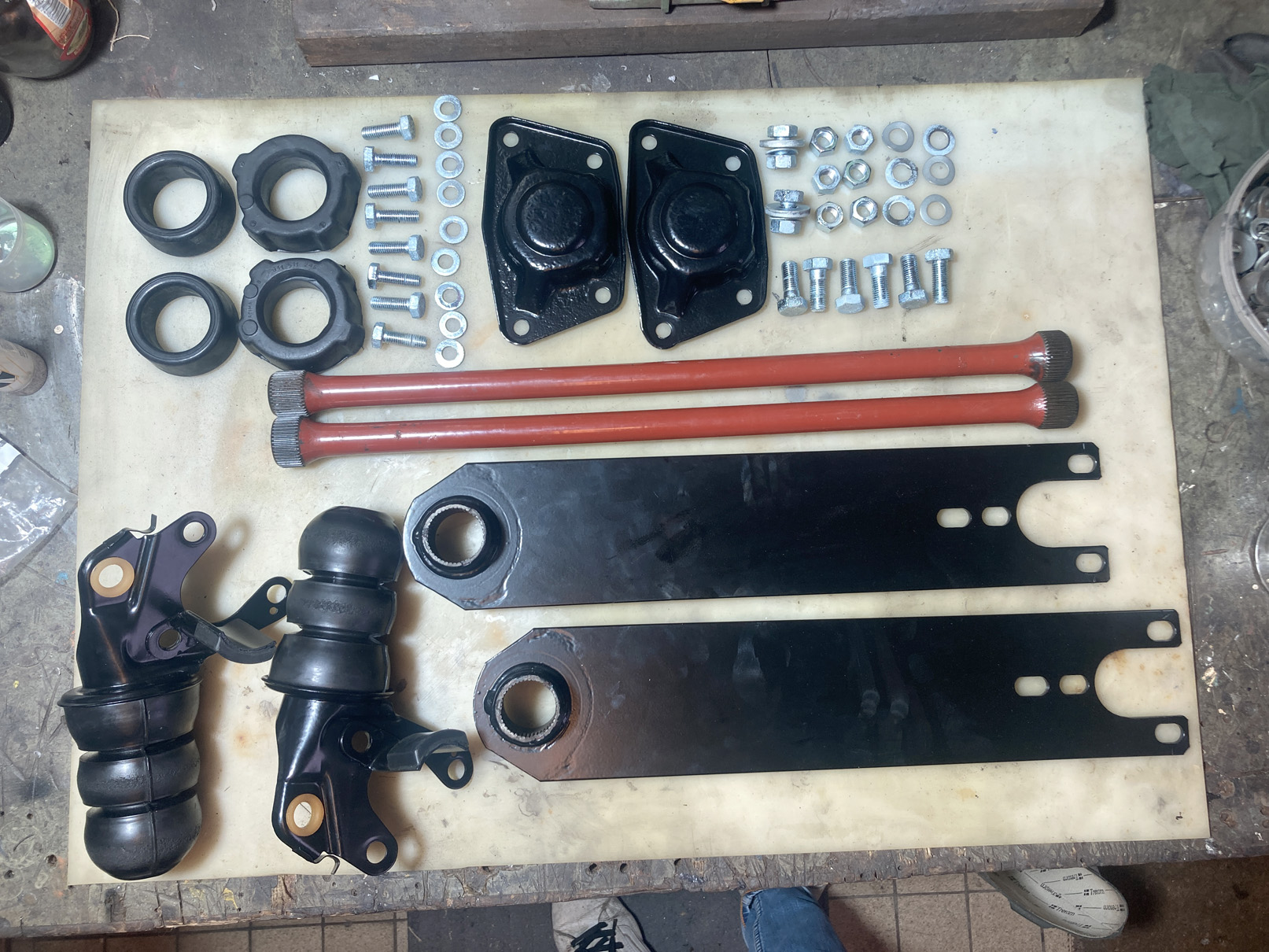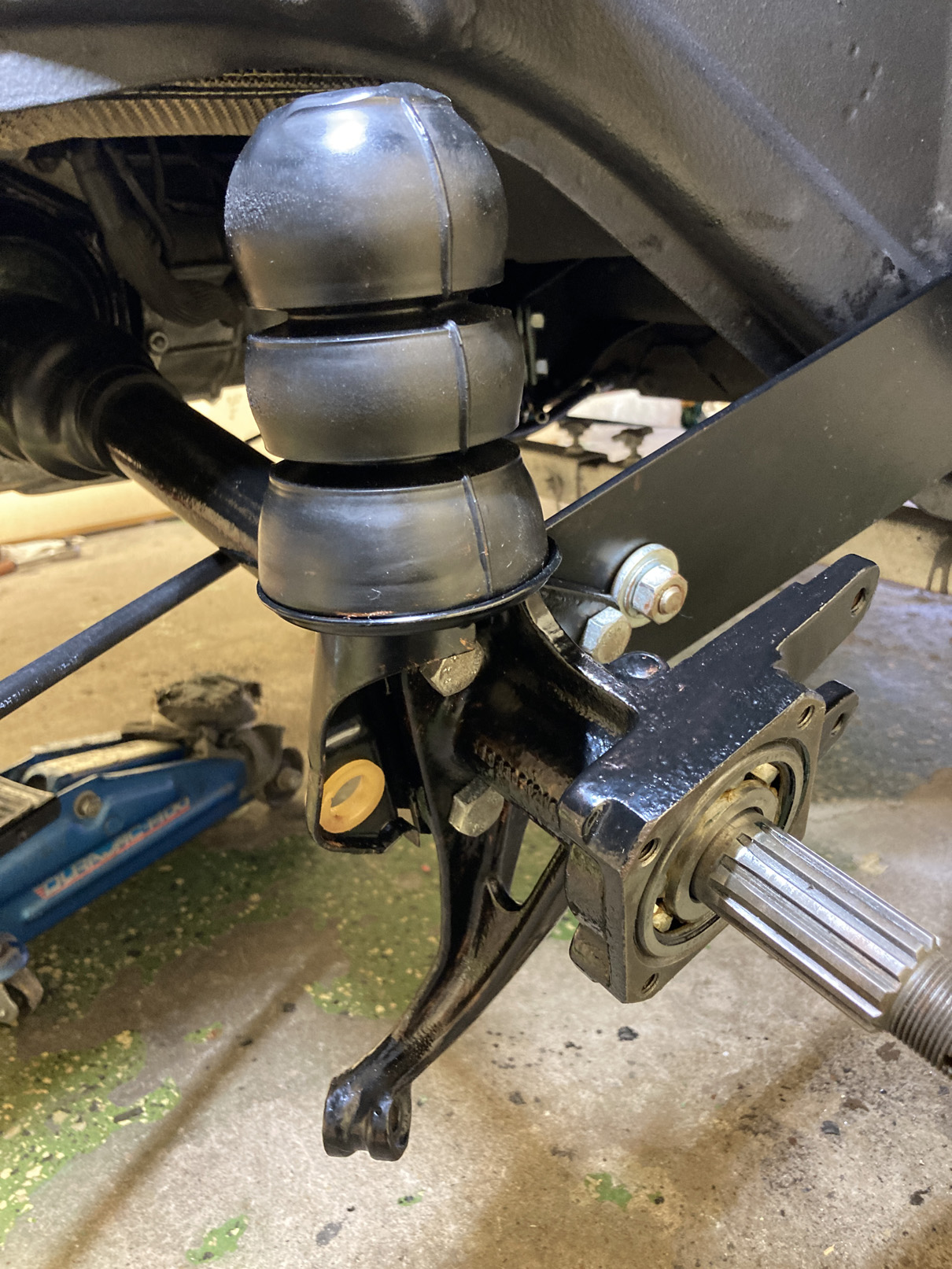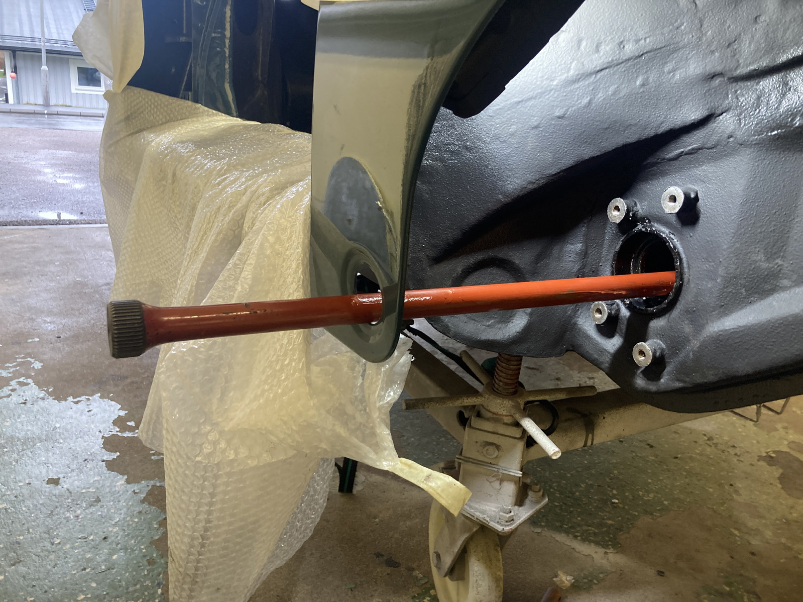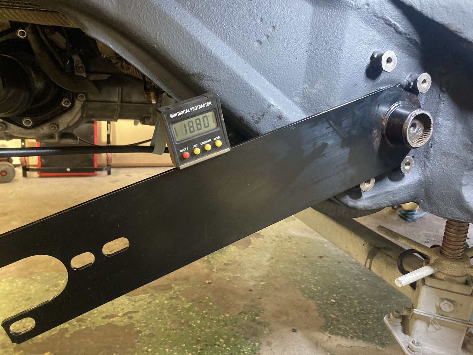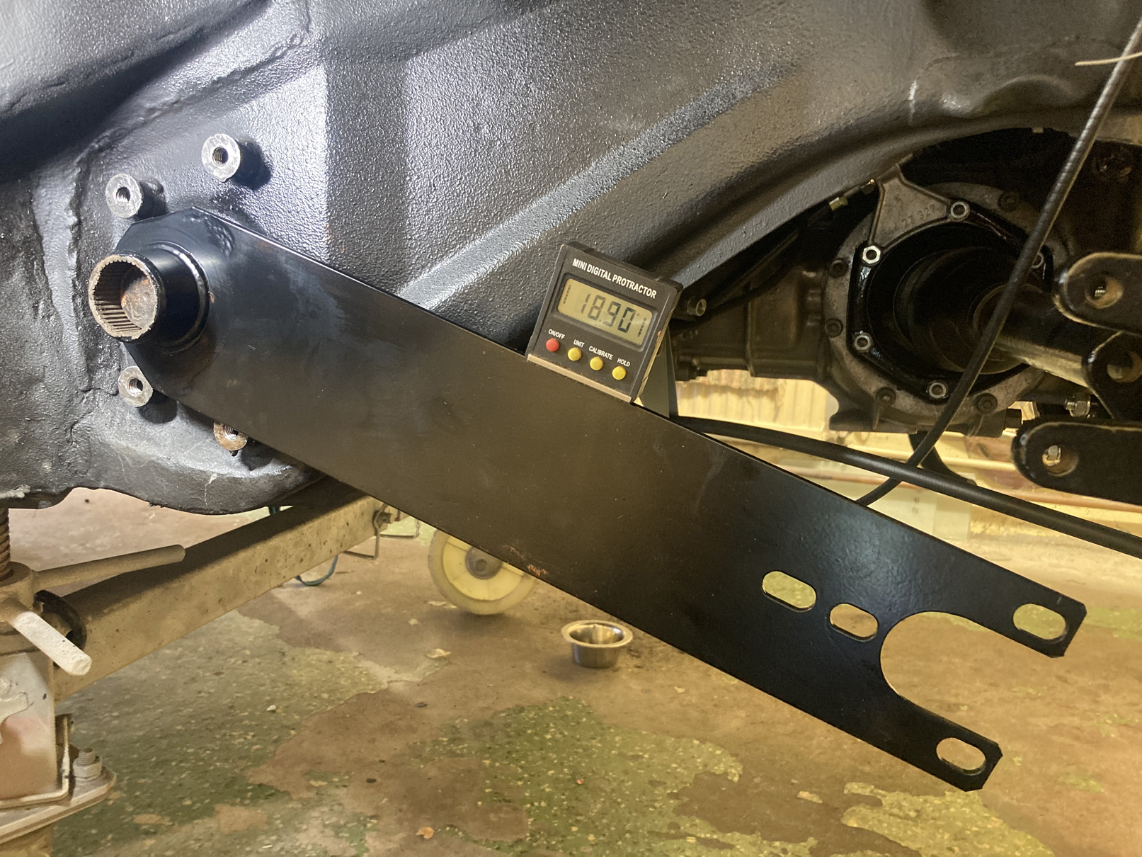 Som ni säkert vet har torsionsstavarna olika splines på inre och yttre fästet. Det gör att man kan finlira genom att flytta ett jack åt ena hållet på inre och ett åt andra på yttre. Enligt Workshop Manual så ska min ha 21°. Jag siktar på att sänka lite och testar med 19°.