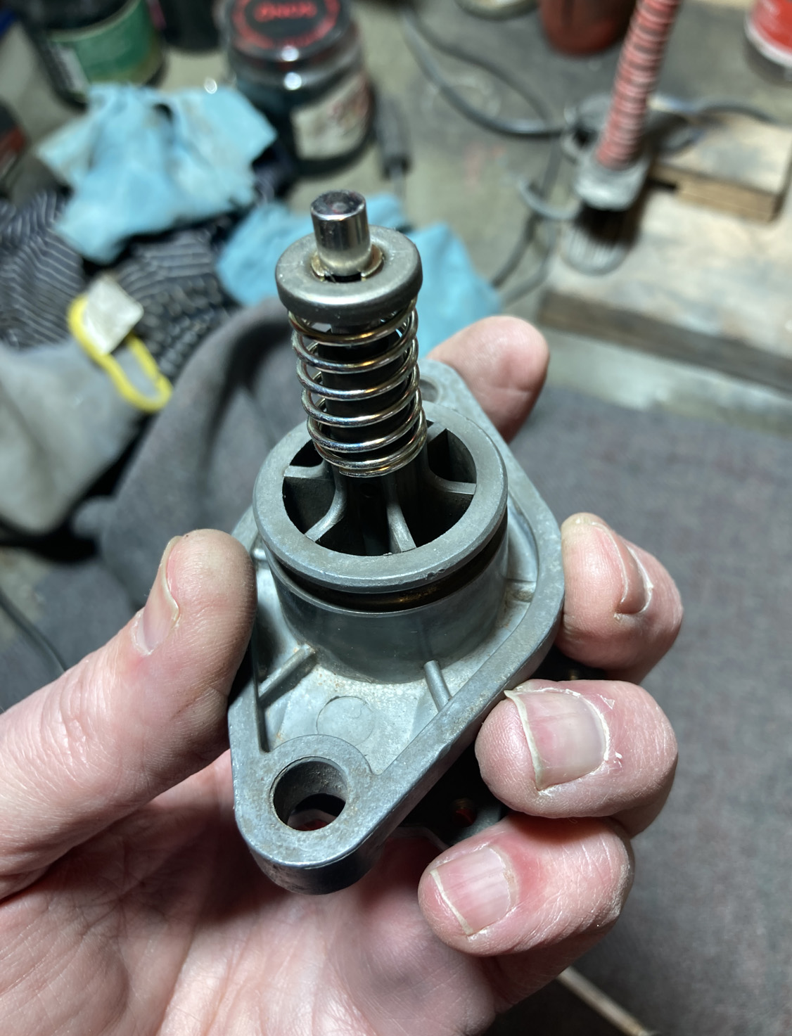 Lite pill och tålamod att få ihop de dubbla fjädrarna och sedan få dit låsclipset. När jag sedan skulle sätta ihop pump-halvorna med membranet emellan så lade jag några träbitar under stången för att få membranet plant vid sammansättningen.