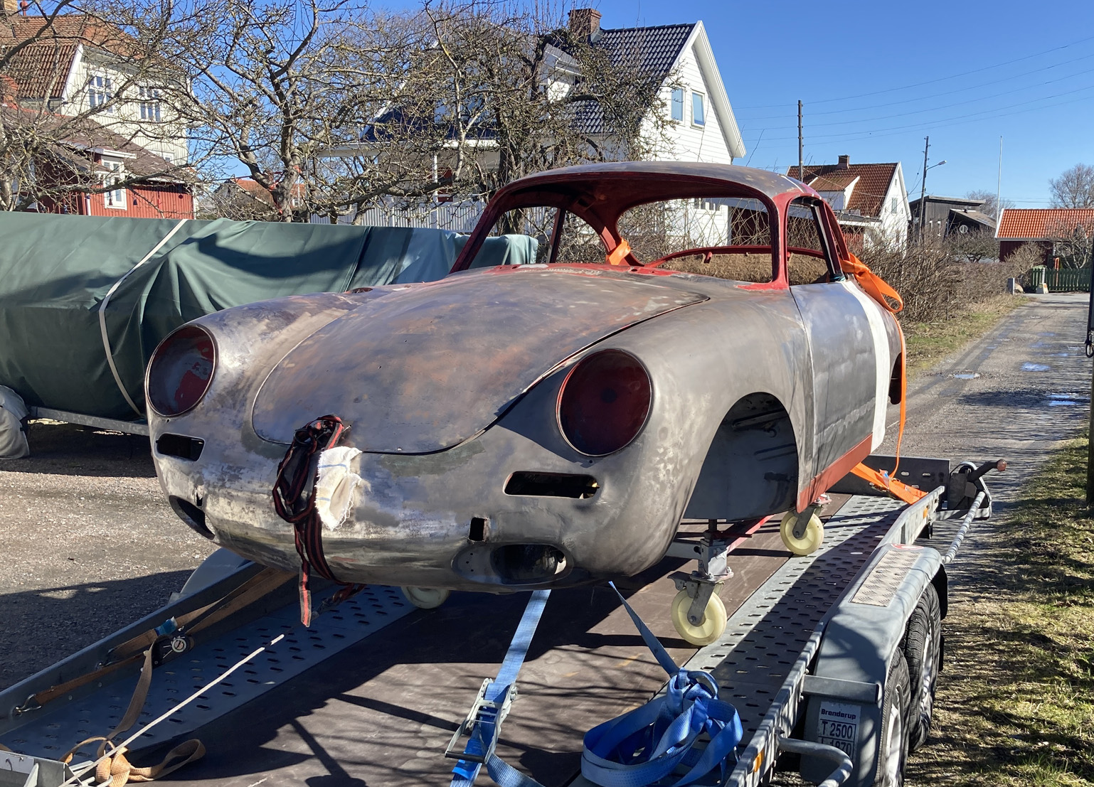 Snö ena dagen, sol andra... Så är det i mars/april. Lyckade boka en solig dag att flytta karossen till min plåtslagares garage. Han är en riktig mästare, en av de bästa jag sett. Så det här ska nog gå bra!