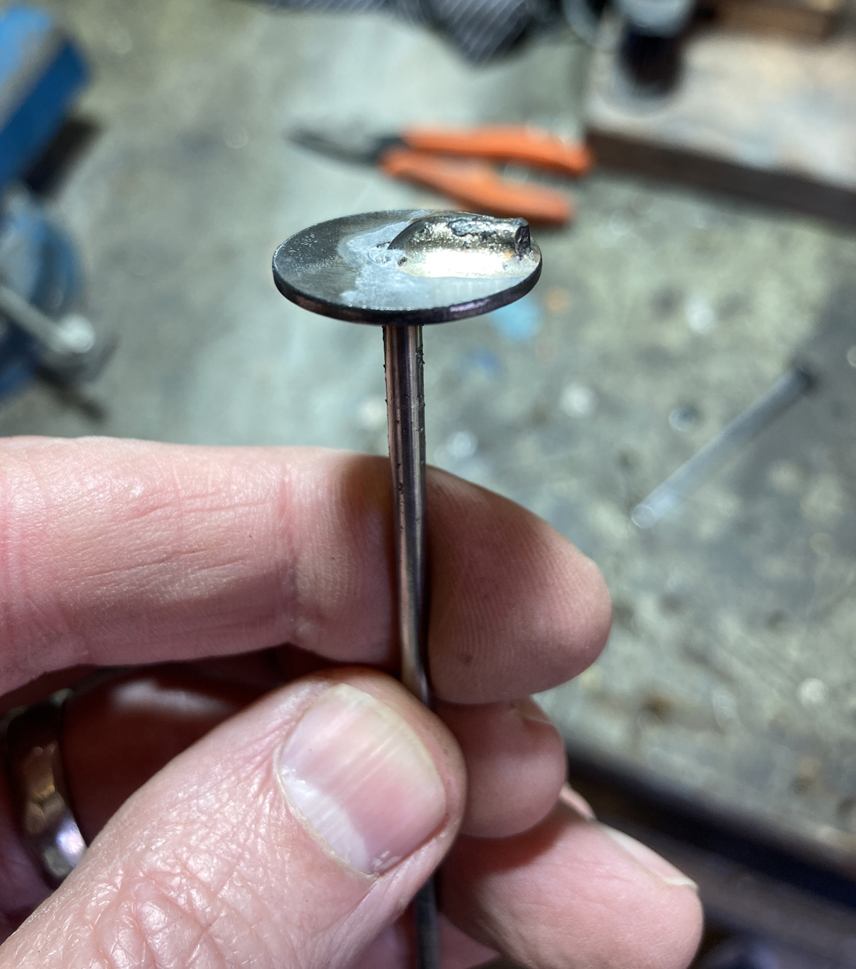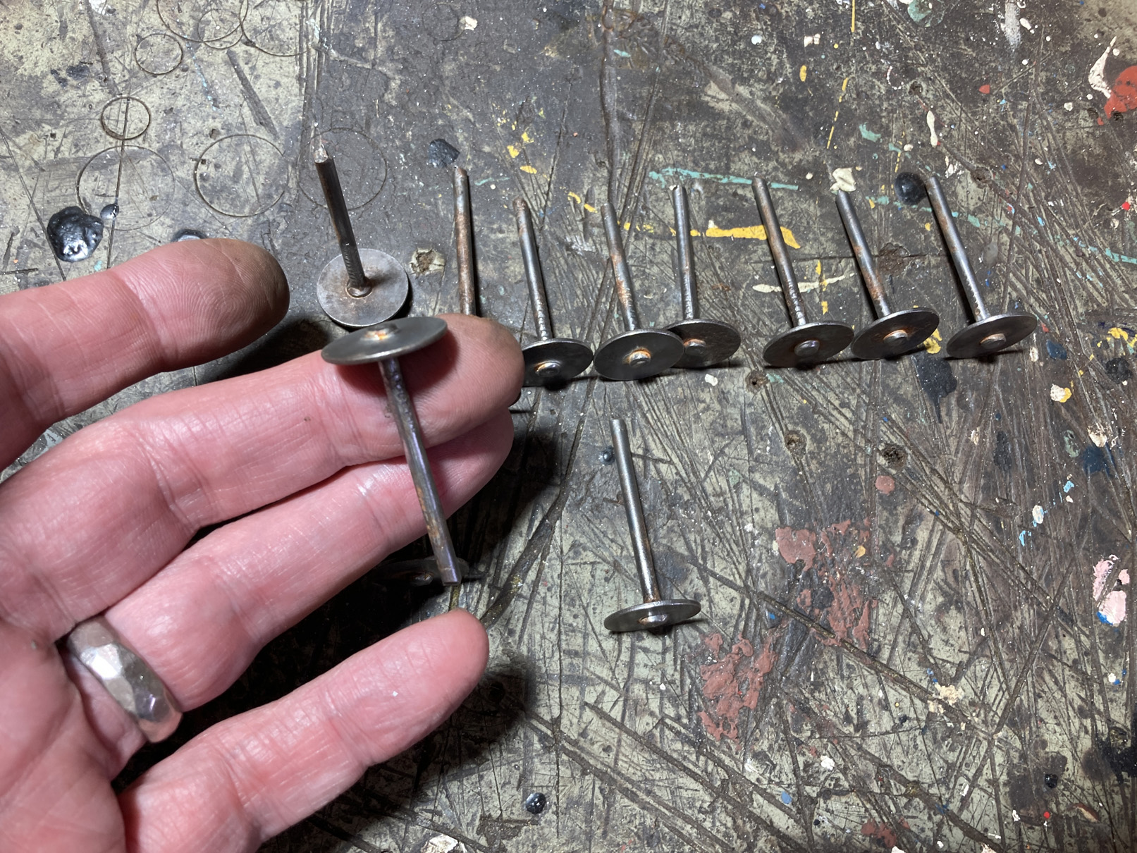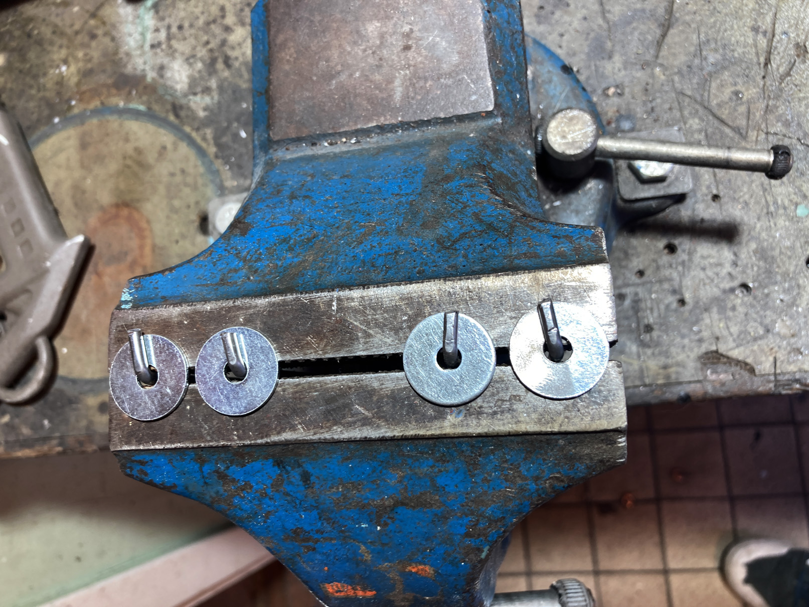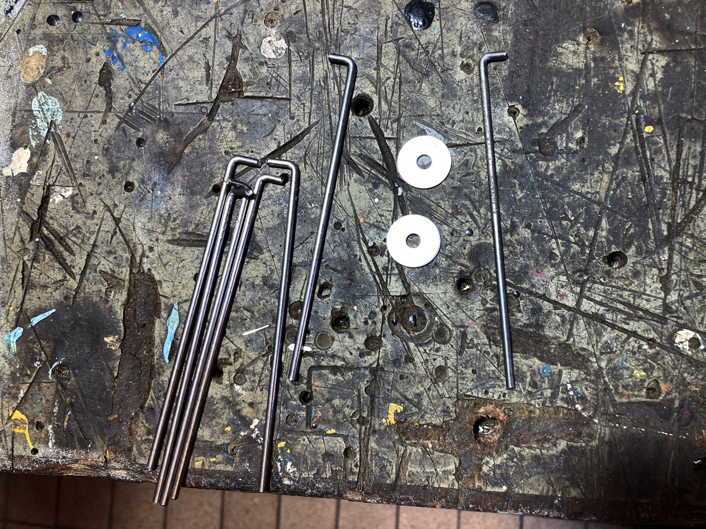 Jag klippte till lagom längder och bockade änden 90° av 3 mm rundstång. En 20 mm stålbricka hålls på plats i skruvstädet.