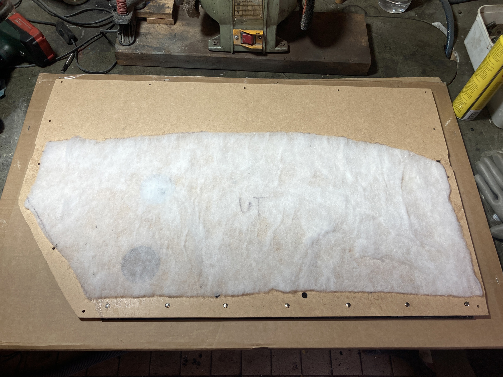 Panelen som sitter längst bak mot brandväggen hålls på plats av 11 stycken "stift". De ska vara bortemot 15 cm och har en bricka på 2 cm i ena änden. Den brickan sitter mellan vinyl och stommen (som original är en papp som i mitt fall är i förfall) och sticker således ut på baksidan. Stiften förs igenom isolering på insidan, genom brandvägg och motorrums-isolering. Där sitter en låsbricka som träs över stiftet.