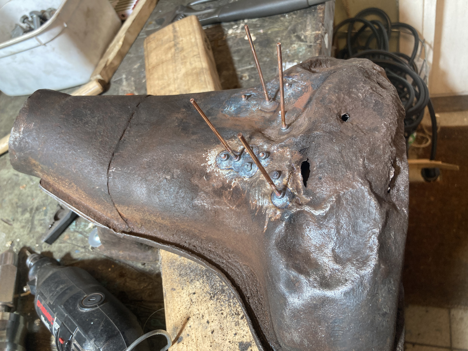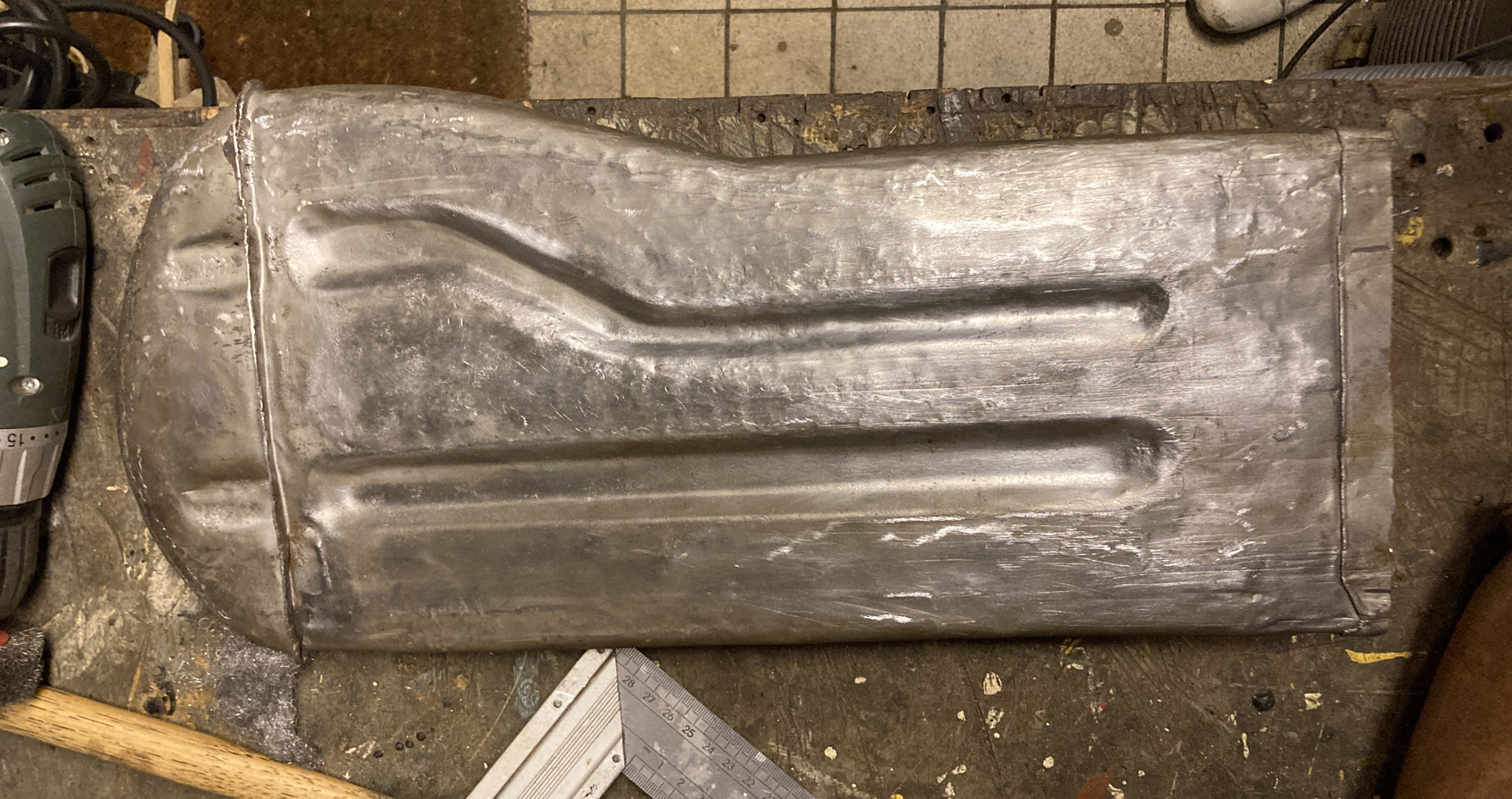 Ja en träplugg hade varit fint! Nu använde jag diverse träbitar och mothåll. En del i problemet är att man slår ut veck och bulor och då sväller oundvikligen plåten. Har krympt vissa delar med värme för att motverka. Ska slipa lite försiktigt när allt blivit svetsat (så att inte det blir för tunt) så får det bli bra sedan med färg på.