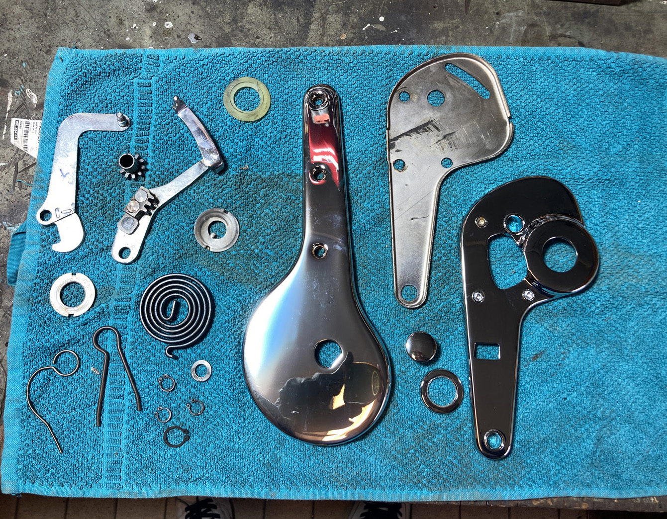 På menyn för dagen står alltså gångjärnen till stolarna. Bara att göra tvärtom mot demonteringen! Bilder från den hjälper. Detta är alla delar för ett gångjärn.