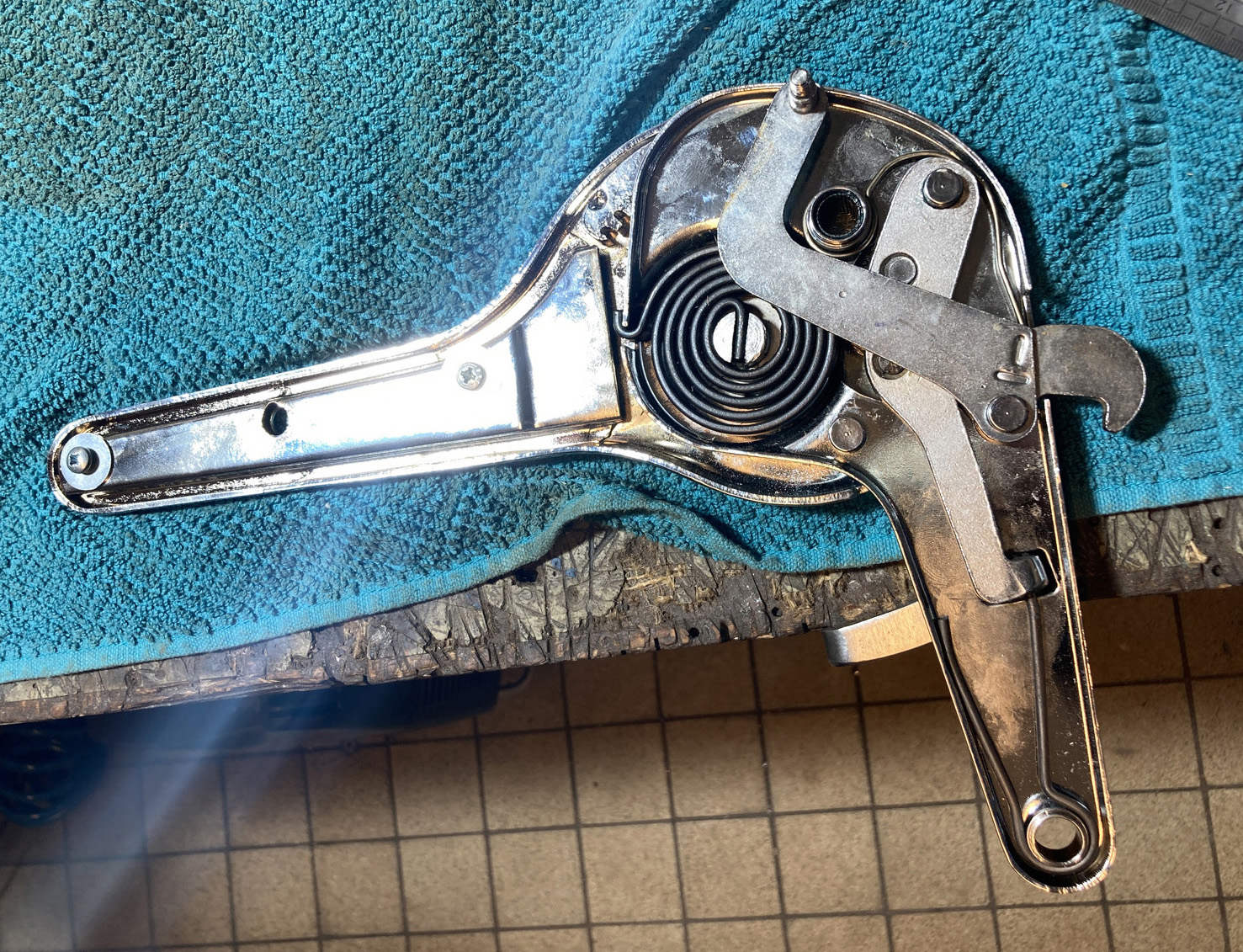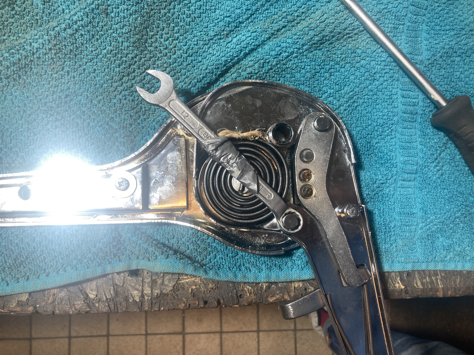 Det pyssligaste med gångjärnen är att spänna den stora fjädern. Har gjort detta tidigare med denna "bonnlösning". Skruvar fast dem i bänken med en handduk emellan. En fast nyckel och en bit starkt snöre. Så lite jävlar anamma. Funkade denna gång också!
