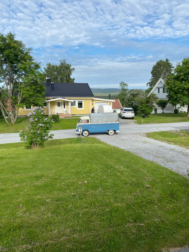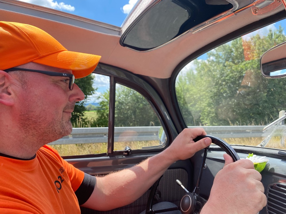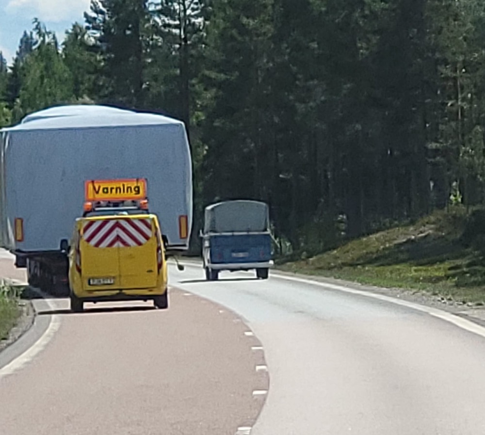 Som tur var fick jag lift av en trevlig man i en soltak oval. Han bor i byn där dom landstiger och har en riktigt fin kärra.