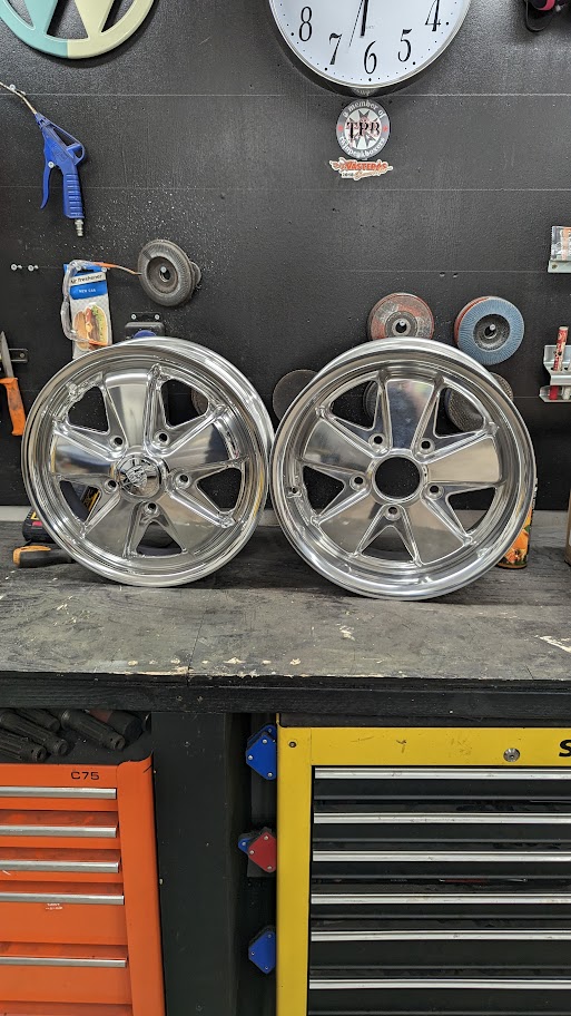 då jag redan hade 2st 6" fuchskopior från JBW(var tänkt som fälgar till ett släp att ha efter lowlighten) så beställdes 2st 4,5" flat4 kopior.. efter att ha sett hur mycket det skiljer mellan dom kommer jag beställa 2st 6" från flat4 att ha bak på bussen. Dessa två från JBW får agera garage prydnad senare, samt agera som mockup så länge.