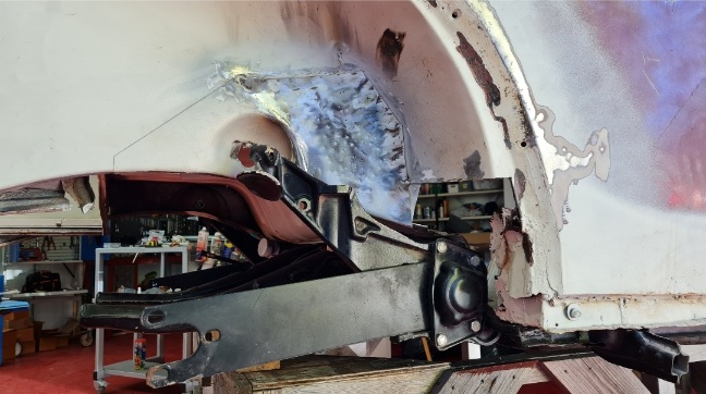 Karossen var vind som en korkskruv. Nu har A-stolpen dragits till rätt plats, pelaren var också så misshandlad att det var nödvändigt att ta bort yttre plåten för korrekt riktning. Nu är pelaren svetsad och tröskeln på plats, dörren passar även i öppningen perfekt. Härifrån går det bra att fortsätta reparera baksidan.